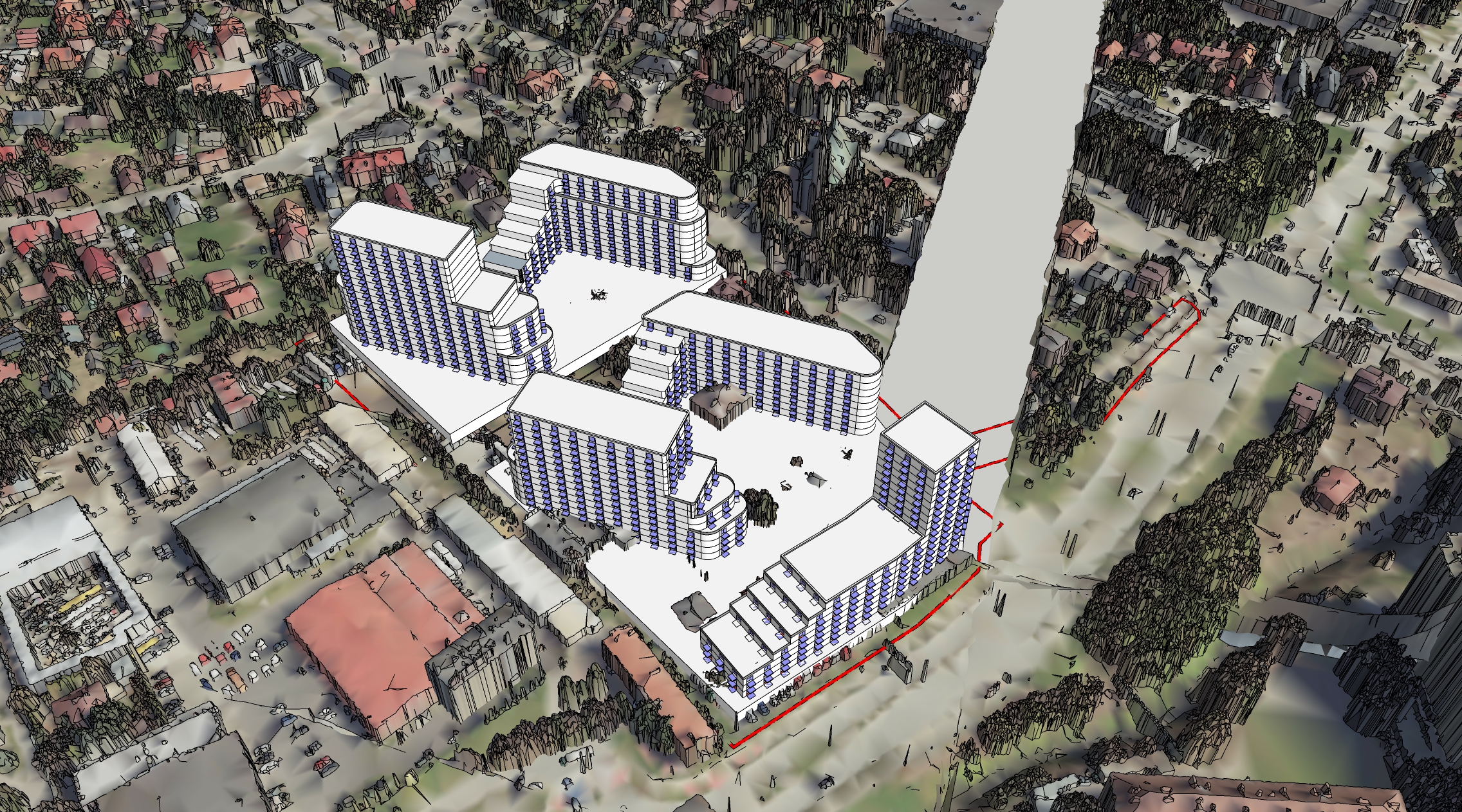 transform this sketchup massing model with google maps surroundings into a highly realistic visualization of a contemporary multi family residential apartment complex keep the exact building footprints heights proportions and overall urban layout as in the original model including the streets context and top view taken from google maps without changing the general massing or site organization convert all white building blocks into modern apartment buildings with clean elegant architecture simple rectilinear volumes large floor to ceiling windows regular facade rhythm and high quality materials such as white or light grey plaster fiber cement panels and selected accents in wood or metal for a premium apartment character clearly express the lower podium as a base volume containing underground parking articulate it with darker facade materials ventilation grilles and entrance ramps suggesting garage access while visually reading as a solid plinth for the buildings above on top of the podium create extensive green roofs and terrace landscapes lush low planting ornamental grasses small shrubs and occasional small trees in planters designed as semi private outdoor spaces for residents add realistic ground level greenery around the buildings and along the streets lawns groups of shrubs small trees and carefully designed planting beds that soften the hardscape and improve the pedestrian environment while keeping the existing google maps roads sidewalks and parcel boundaries emphasize residential details such as recessed balconies and loggias with glass or slender metal railings visible apartment layouts through the windows and subtle variations in facade color and texture to avoid monotony while staying cohesive and contemporary maintain the original camera angle perspective and overall composition from sketchup and preserve the real world surroundings from google maps as the contextual background use neutral daylight with soft shadows realistic sky high quality materials and photorealistic rendering style suitable for professional architectural presentation high detail hyper realistic strength 70 80 maintain colors