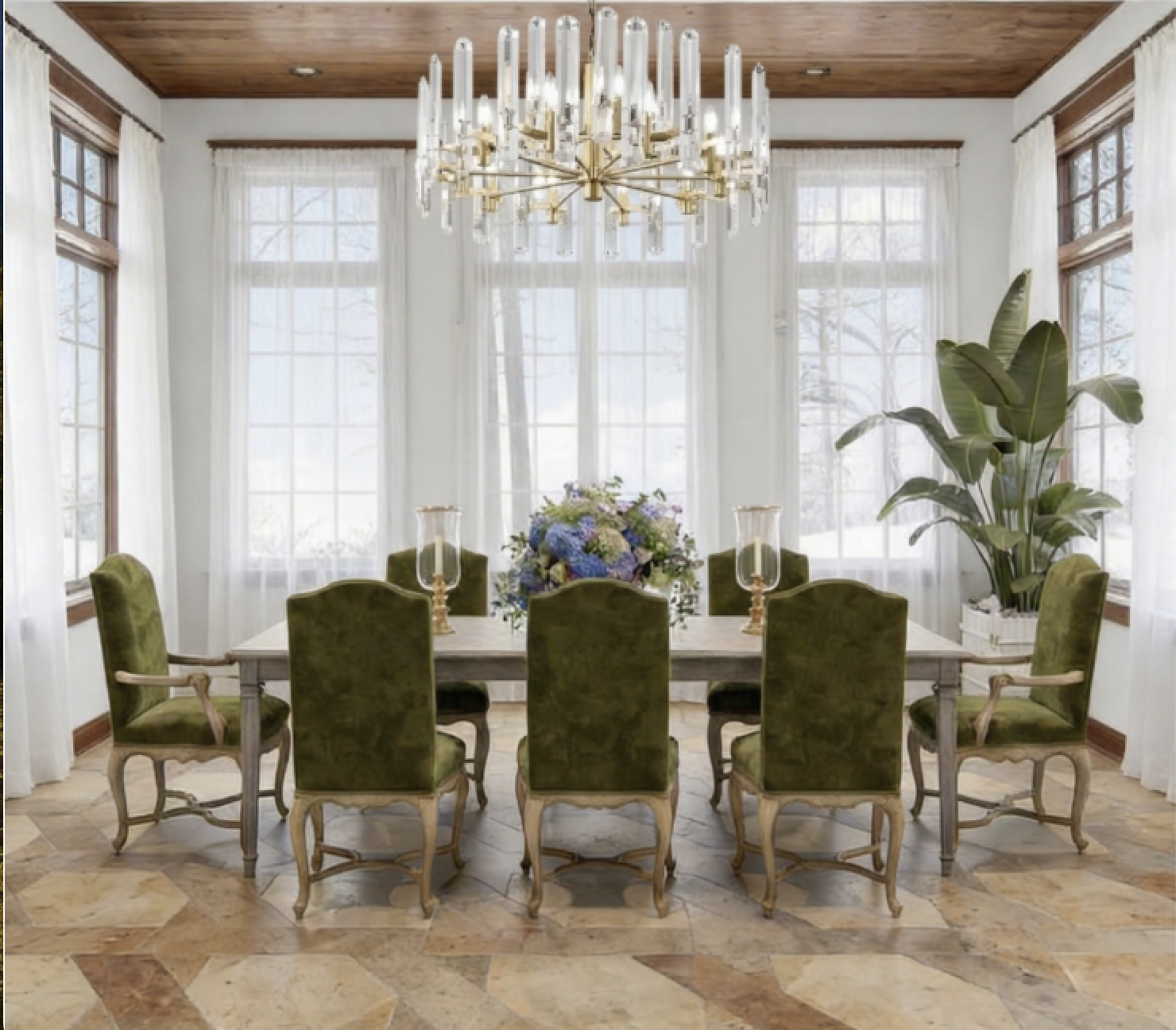 place the chandelier further into the room over the dining table keep all architectural features proportions and lighting the same