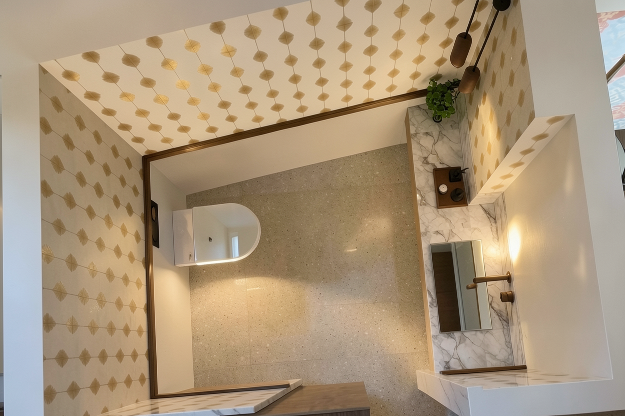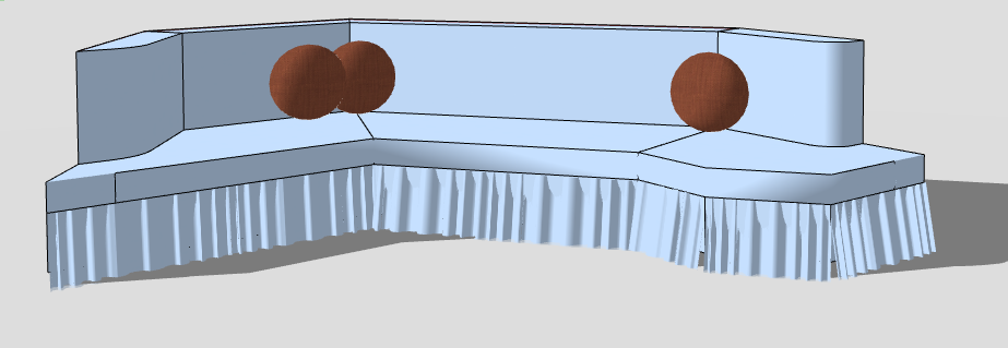 please create realistic render of this sofa the base and back are upholstered with a light blue felt wool and the bottom of the sofa contains pleated fabric in a light blue linen on the sofa are 3 round cushions in a warm red jute linen