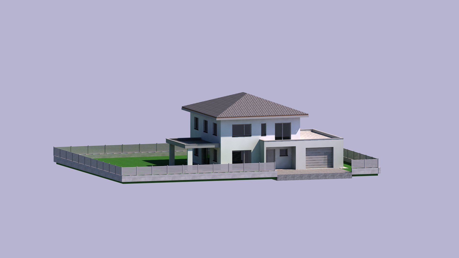 i need a street in front of the house and remove the step in front of the garage add a sidewalk and maybe a car on the street put the sidewalk and the street right before the house now add some trees and plants add a sky and a sun and a little less plants make it seem like there is a neighbour in the background and the house in beige and the windwos in dark grey put a fence in front of the house the roof also dark grey