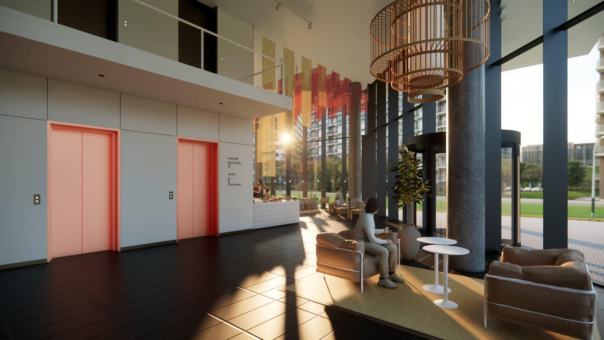 render a modern lobby with a sophisticated and serene atmosphere use warm natural lighting to highlight the space the walls feature elegant grey marble with intricate patterns contrasted by smooth wooden paneling in a soft brown tone the floor is composed of sleek dark tiles creating a refined base the reception desk is crafted from white marble keep the same logo on the white marble complemented by contemporary white chairs adjacent to the desk a plush beige armchair sits on a light tan rug exuding comfort large potted plants add a touch of greenery and vitality overhead stylish woven pendant lights in a warm natural fiber provide soft illumination the elevators are designed with bright red doors that stand out against the muted color palette keep the same information written on the elevator wall ensure a sense of modernity and openness with large glass windows that allow natural light to flood the space casting soft inviting shadows