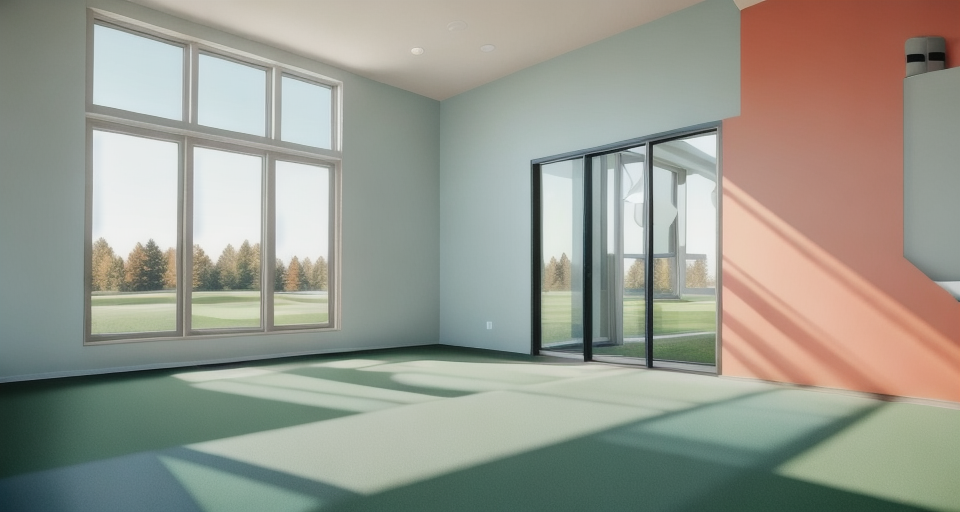 flex room gym tv lounge facing right wall with sectional looking out to nice covered patio add golf simulator to the right