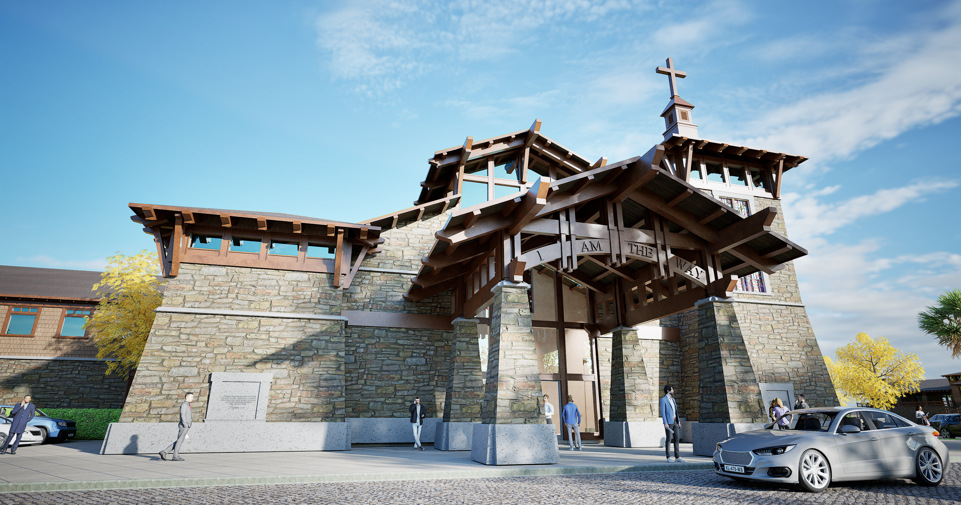 turn into photo realistic rendering with bright california sunrise shining at front and lights inside the building shining through the windows add street lights