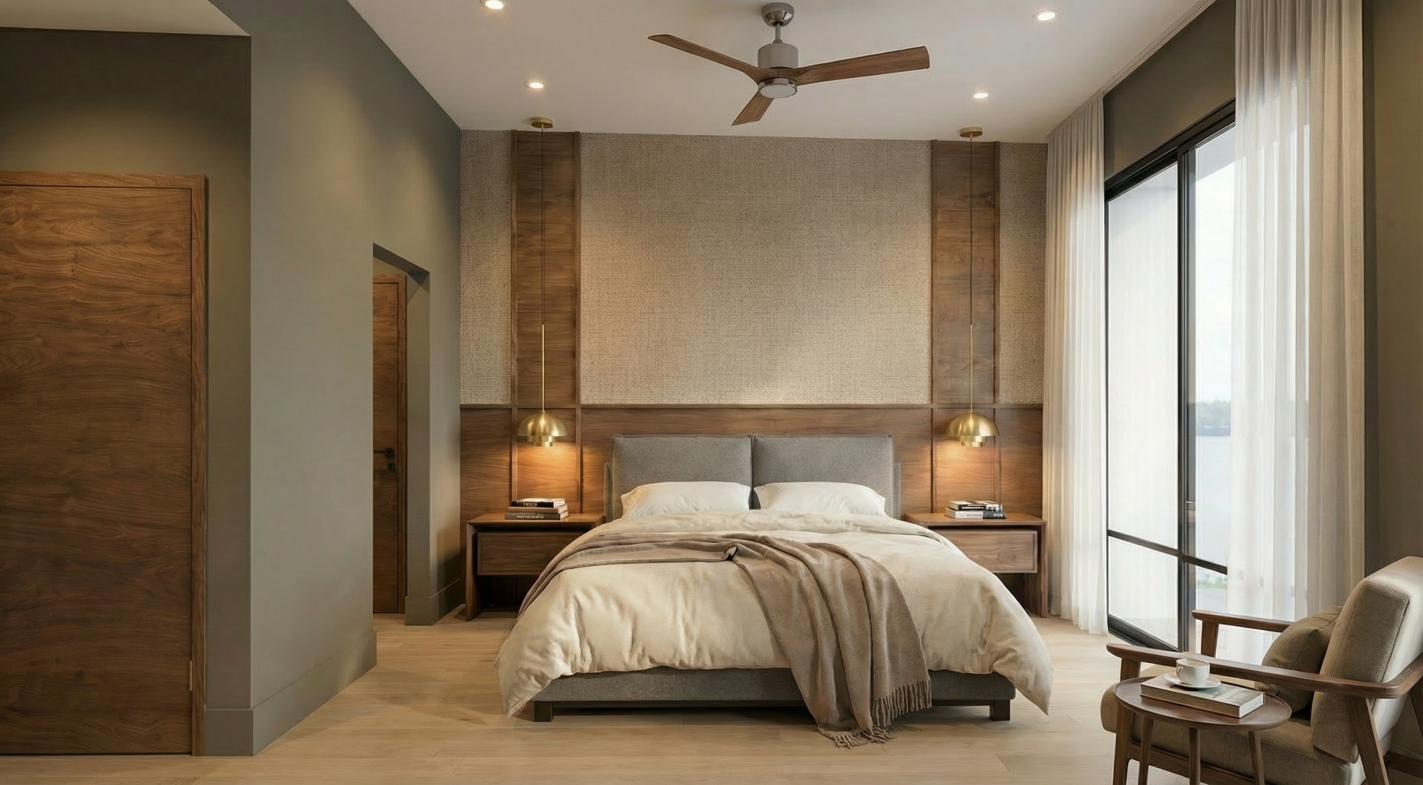 add wood door with casing in opening on far left of image create floor to ceiling cabinetry style paneling for wood area in foreground on left