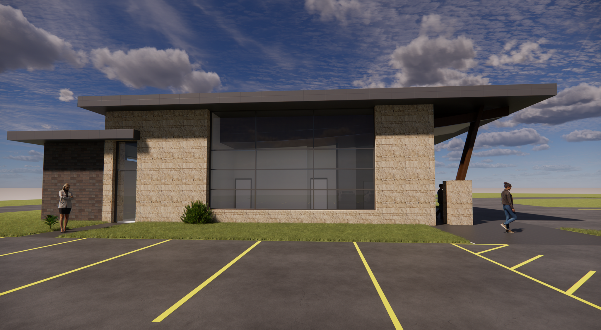 add landscape bushes next to building walkway with curb dont change the image perspective