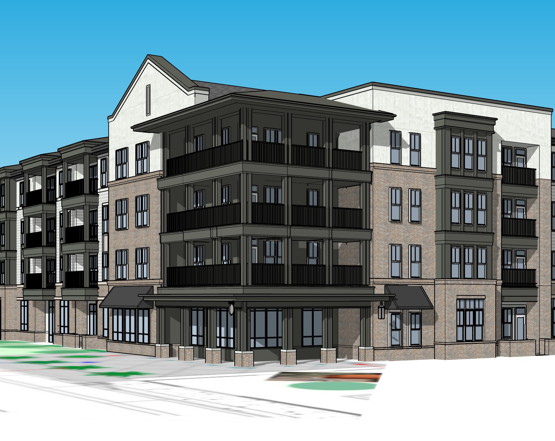 daytime view with white brick white stucco and dark gray trim black windows