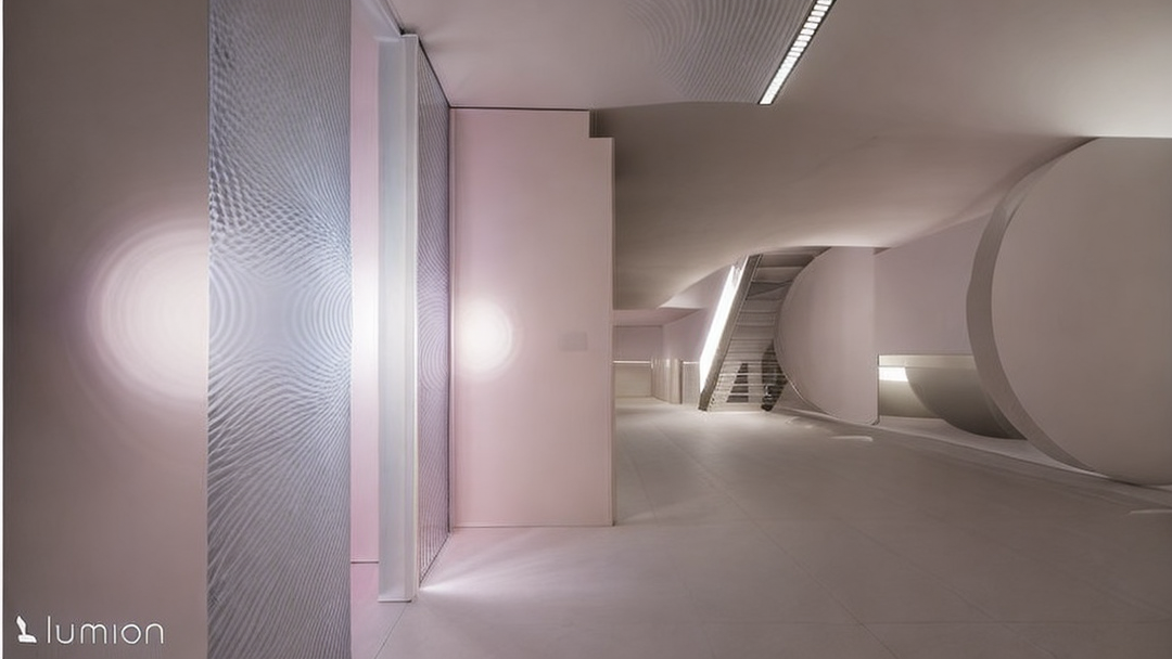 interior shot render the hallway with interactive haptics and gaming computers in the hallway have people come out of the silver elevator