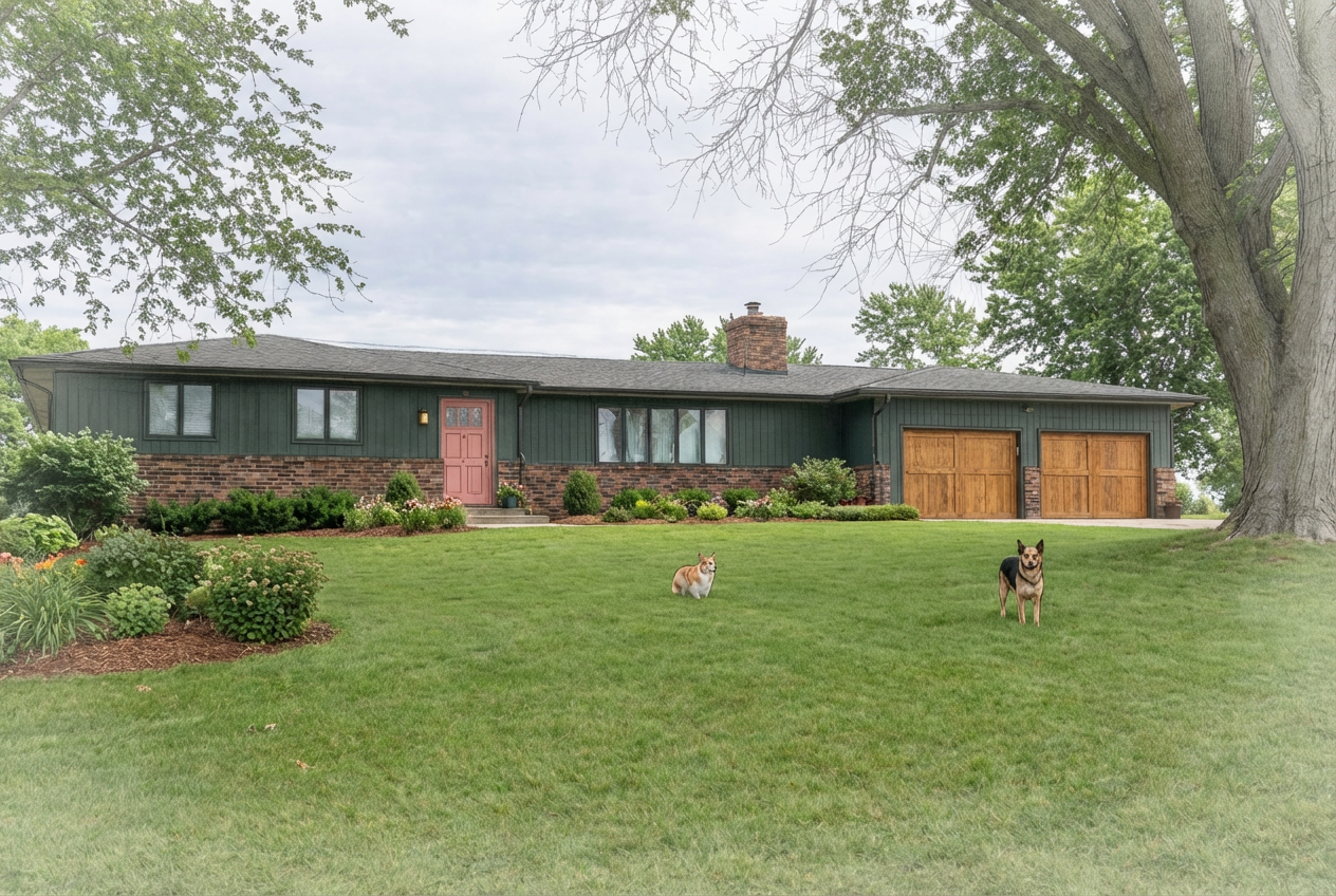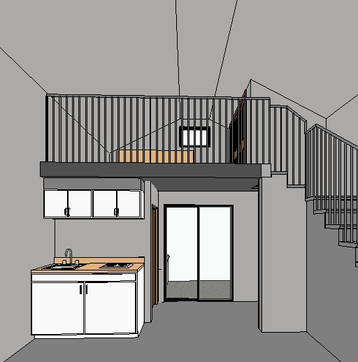 walls and ceiling to be painted white the stairs and railing to be black the floor is to be concrete add recessed lighting under the loft and a white tile backsplash above the countertop make the cabinets color duke blue and the kitchen faucet black add a mini fridge under the stovetop add a pool in the backyard as the background outside