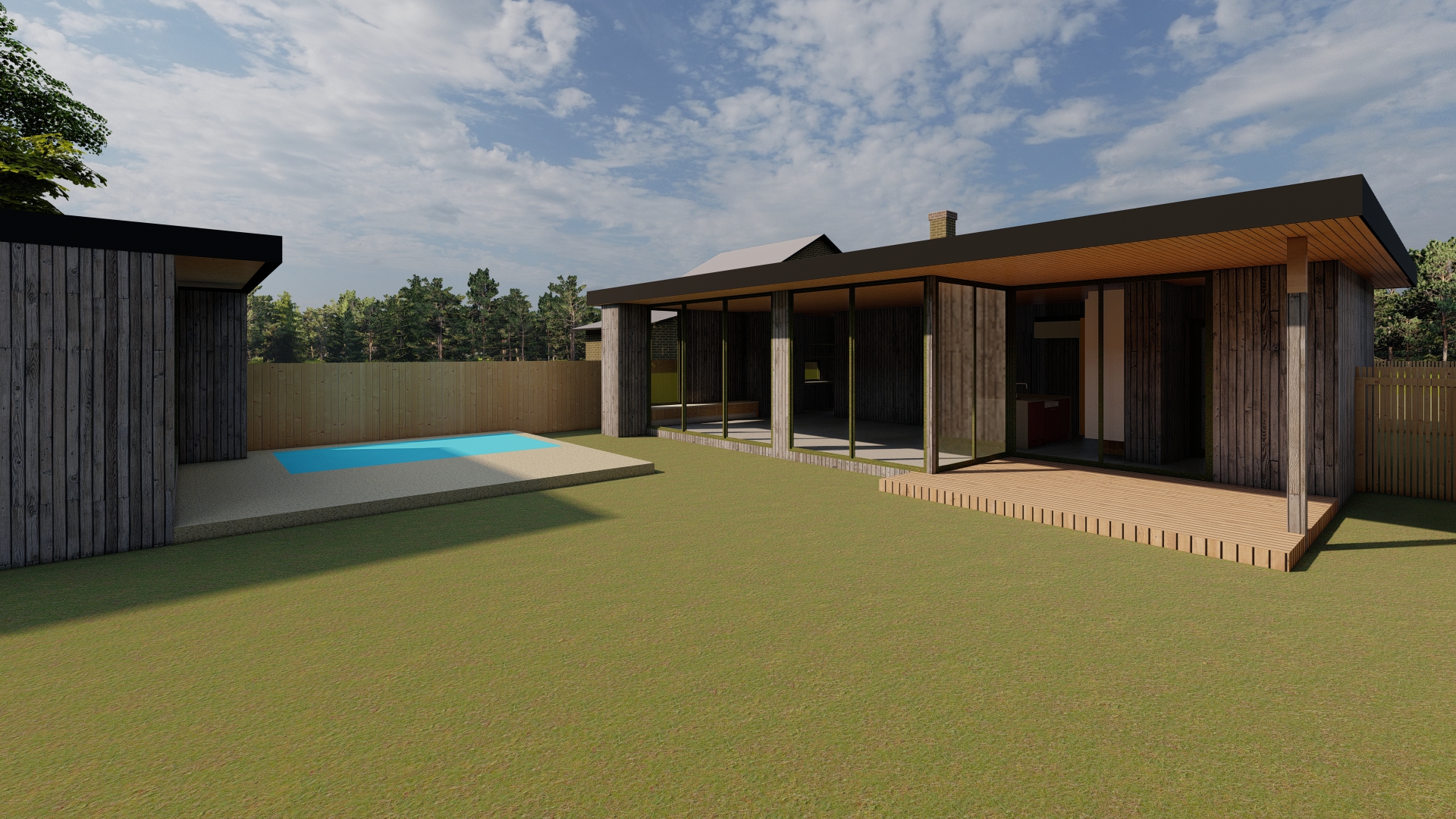backyard with pool lush green forest back drop with lush tropical plants around pool pool is coloured in blue