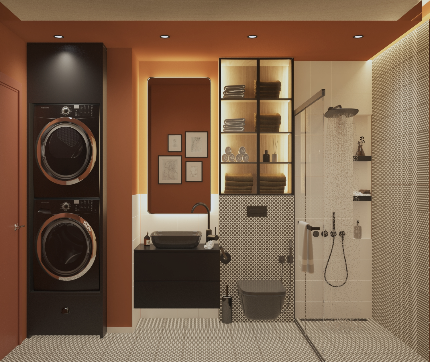 ultra realistic architectural interior photography natural global illumination soft indirect lighting bouncing from walls and floor physically accurate light behavior subtle ambient occlusion in corners balanced exposure like a professional interior photo warm led accent lighting in shelves and behind mirror realistically glowing and illuminating nearby surfaces soft falloff of light slightly darker corners for depth natural shadow gradients realistic materials with micro imperfections slightly rough matte paint walls subtle texture on tiles realistic reflections on glass shower panels brushed metal fixtures natural stone sink with fine surface detail photographed with full frame camera 35mm lens f 5 6 iso 200 hdr interior photography cinematic dynamic range realistic contrast natural color grading no cgi look no overexposed highlights soft bloom from lights high end interior photography ultra detailed photorealistic rendering