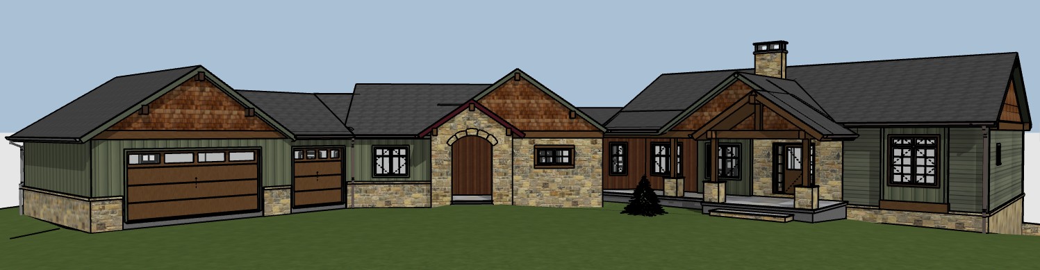 make photo realistic add driveway front walk landscaping with river rock and low mountains in background move sun to front of house midday asphalt shingle roof
