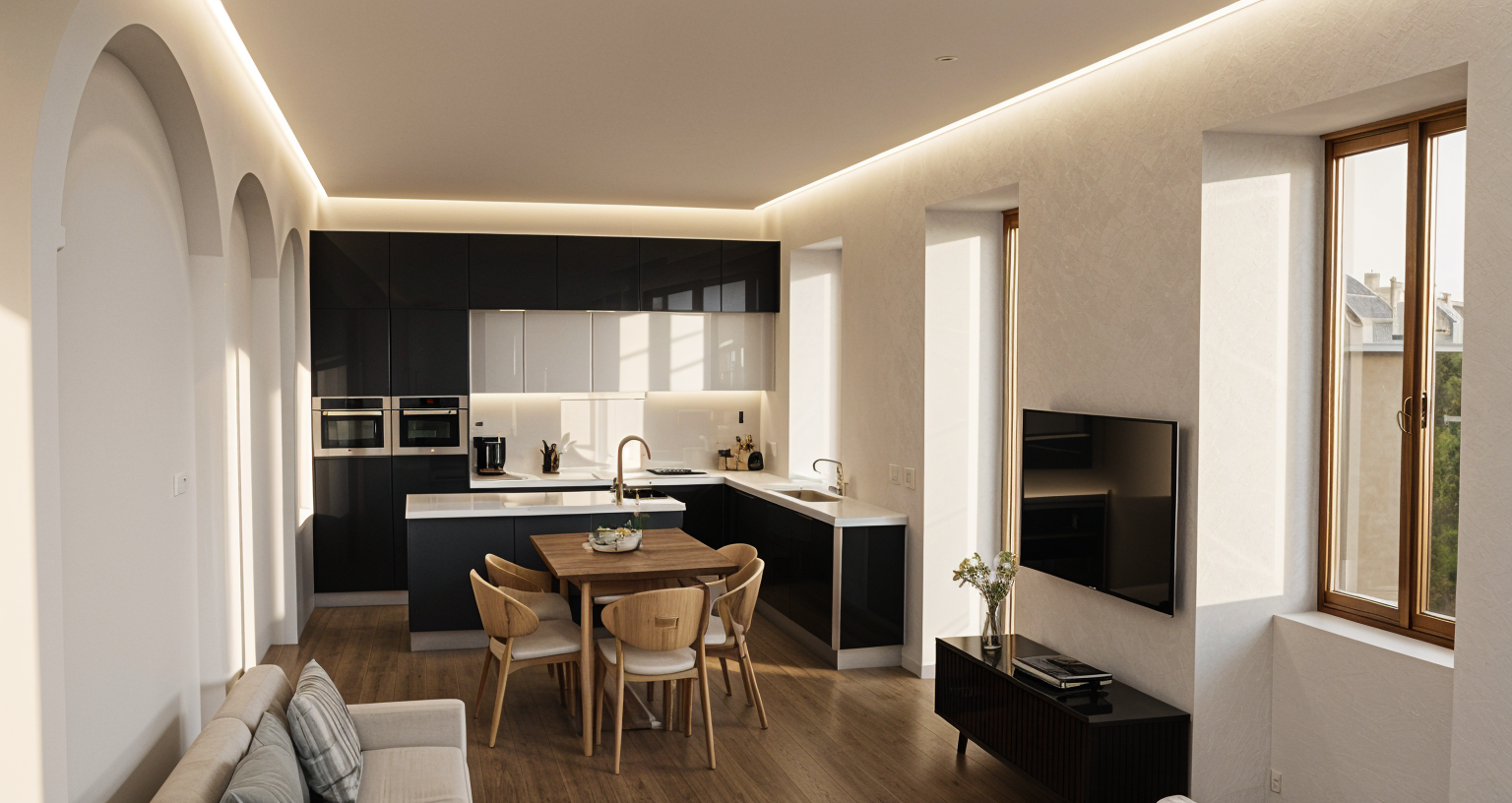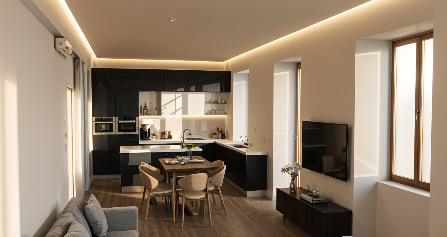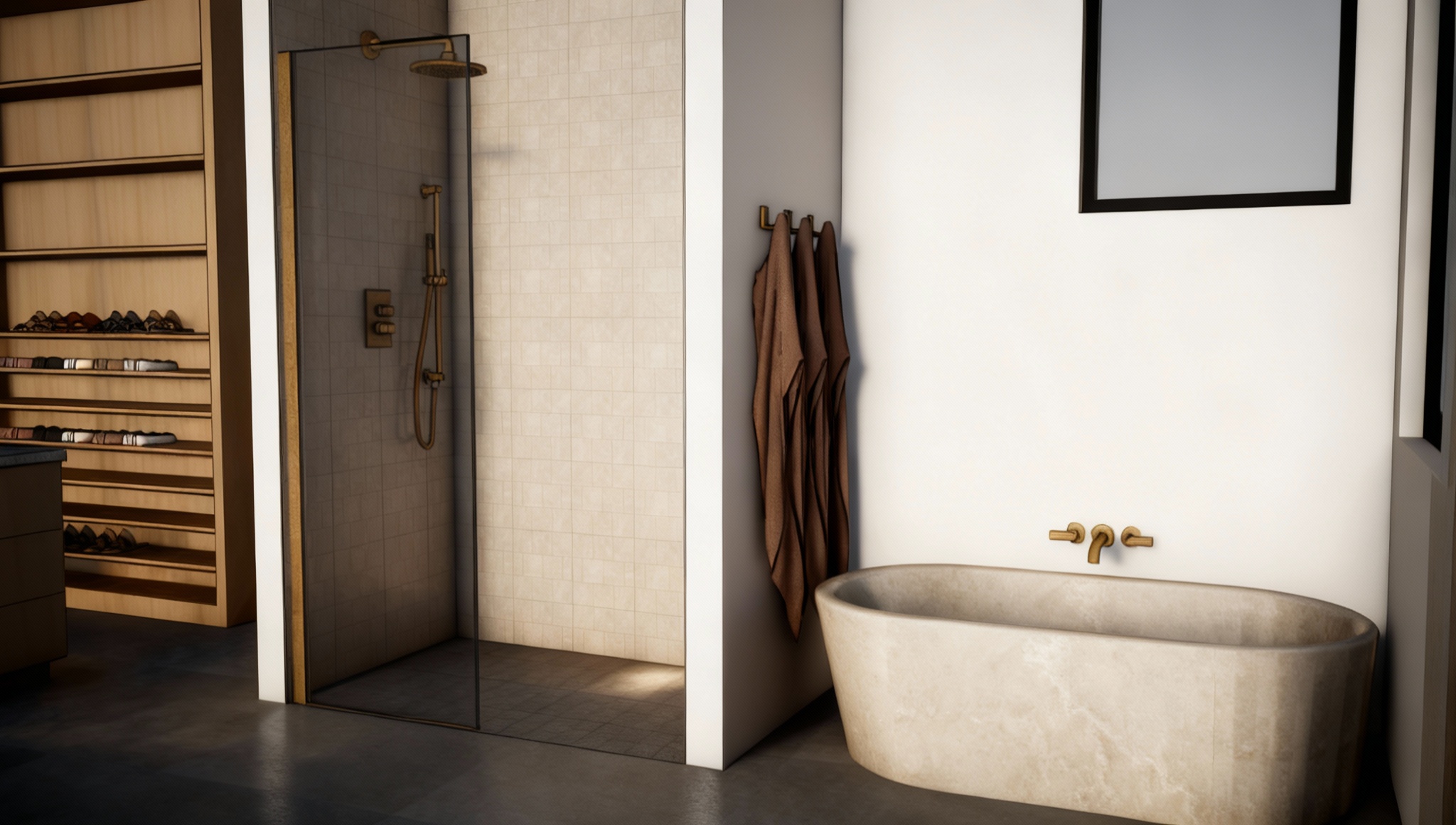 render make all the wood medium brown ash wall around and on the door is bronze grey mirror wall behind wine bottles in slabs with indirect lighting