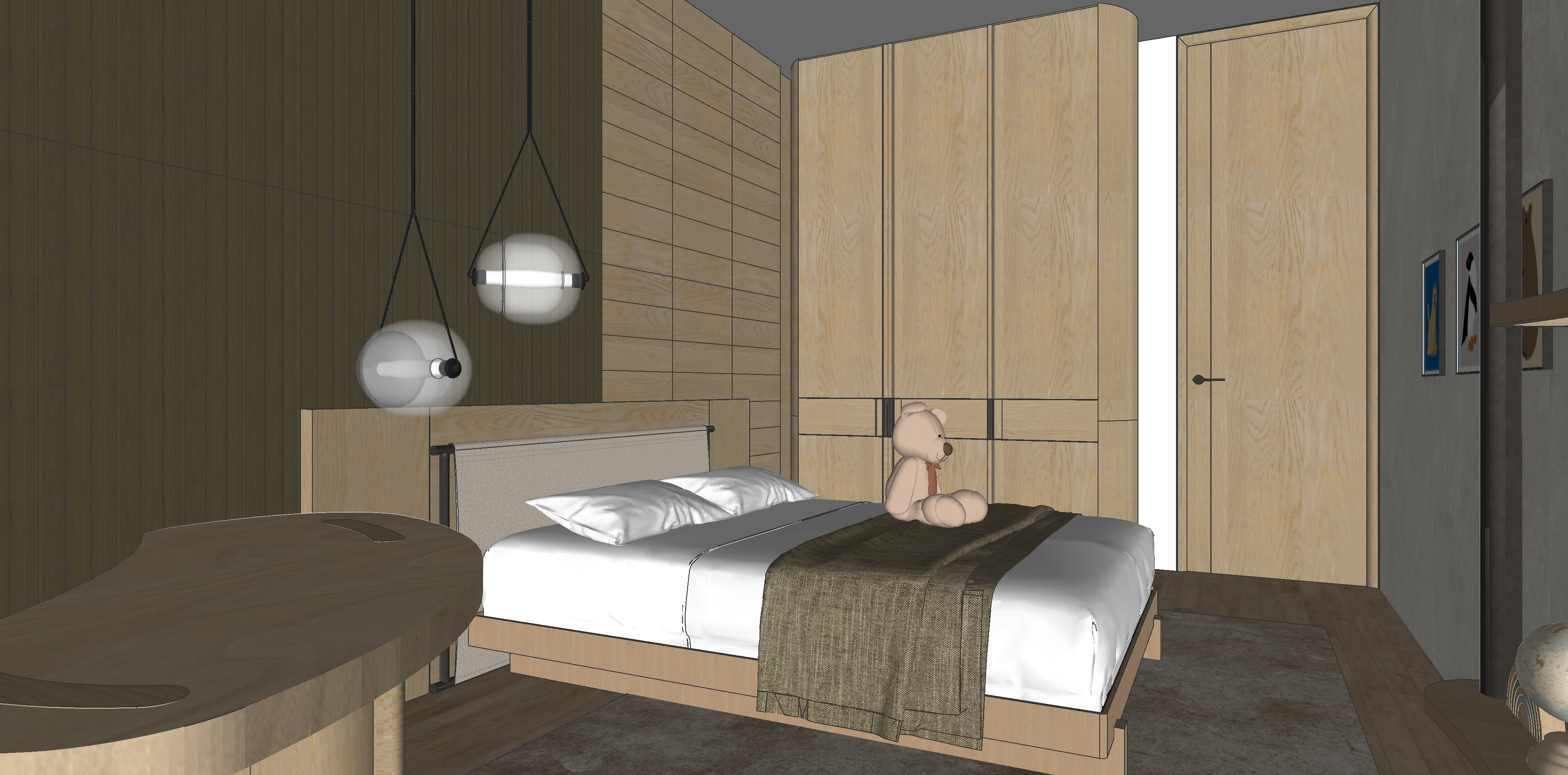 render a morning view keep all the material colour and tones make the wood more light beige blonde colour remain the green colour wood vertical panel