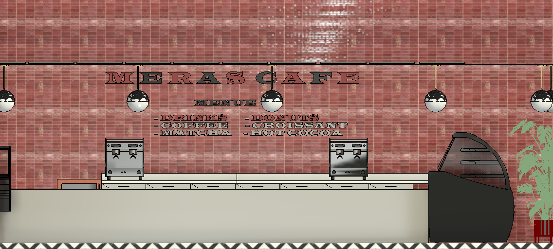 keep as an elevation view inside the buidling in this case its a coffee shop increase realism the wall consist of pink tiles back splash not red brick