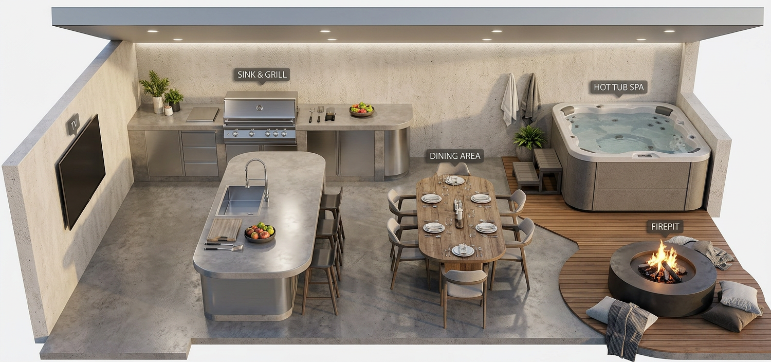 remove the island with a sink and replace by a dining table replace the firepit by a fireplace