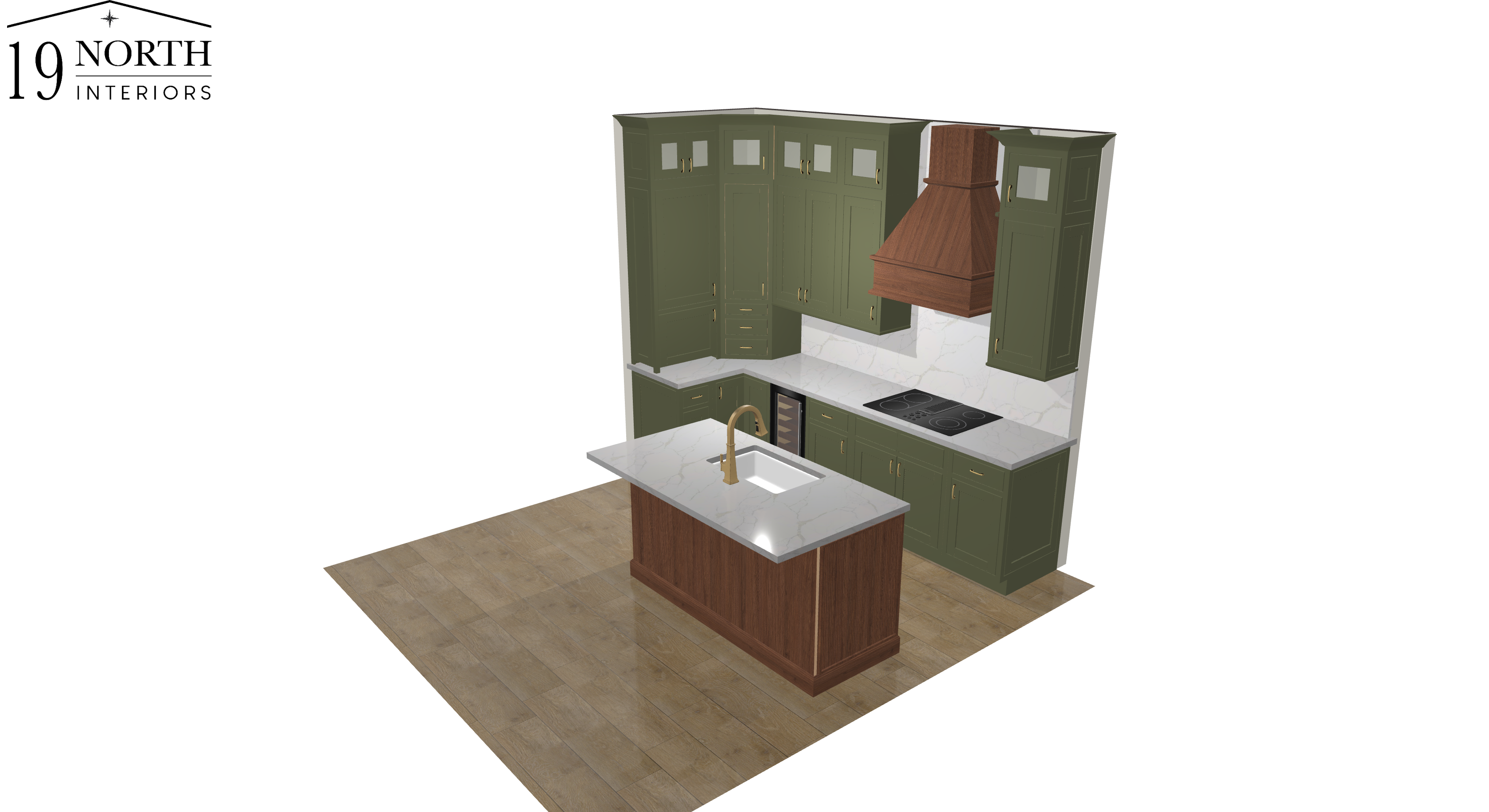 this is a kitchen display or green and walnut cabinets architectural interior design timeless photorealistic