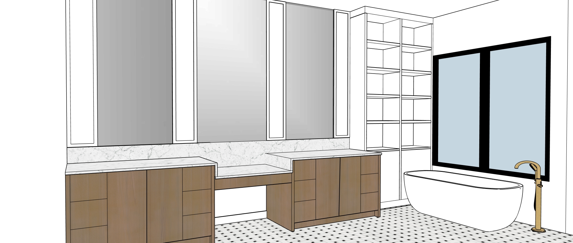 photorealistic interior bathroom rendering preserve all geometry layout millwork design materials and proportions exactly as shown do not alter or reinterpret any elements vanity mirrors render all upper panels as true reflective mirrors with accurate reflections no opacity no fogging no tint lighting soft balanced natural daylight even exposure with no blown highlights or washed out areas maintain contrast and depth with subtle ambient bounce light no harsh direct sun rays or overexposure window clear exterior view with a soft blue sky neutral daylight tone no sunset no dramatic lighting no over bright glow materials wood vanity natural tone matte satin finish visible subtle grain not overly pronounced countertop backsplash light stone with soft veining clean and refined floor tile crisp high definition pattern sharp grout lines tub walls clean white soft shadows for depth brass plumbing warm brushed brass controlled highlights no glare rendering quality ultra sharp high resolution output strong edge definition and clarity no blur no softness realistic shadows and reflections physically accurate materials pbr camera straight on perspective natural lens no distortion no wide angle warping do not add remove or restyle any elements focus only on realism clarity and balanced lighting