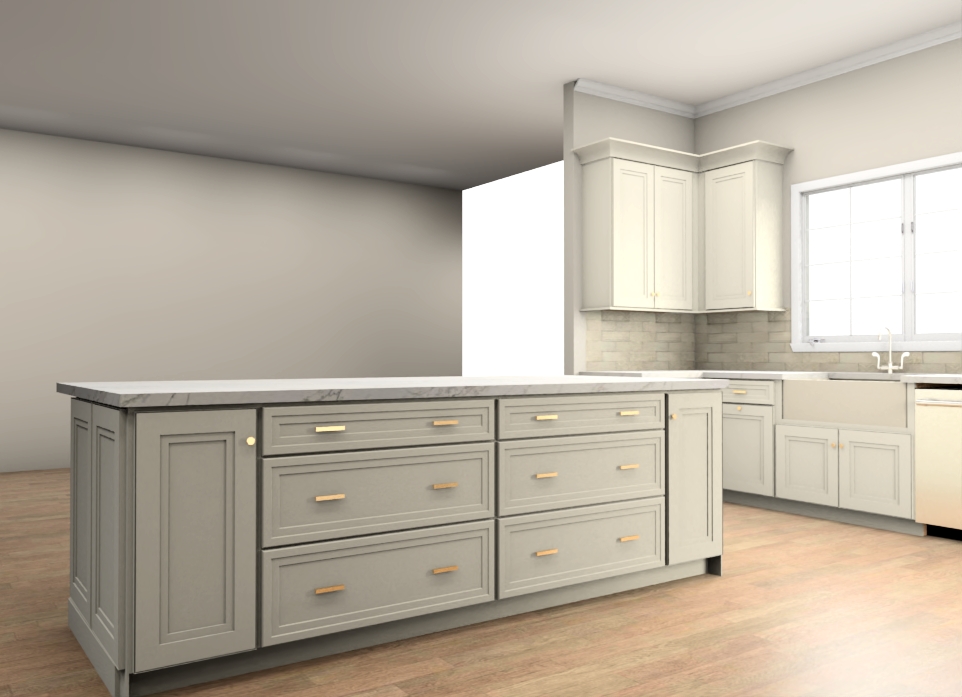 create a hyper realistic photo from this kitchen rendering do not alter the cabinet details in any way cabinets are alabaster with taj mahal countertops magazine look image natural lighting with sunlight streaming in