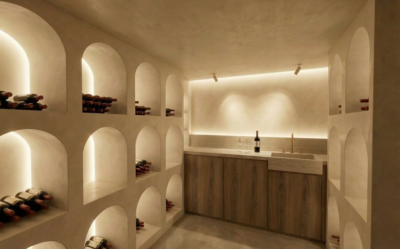 soften the light flow from the wall mounted spotlights to reduce intensity on the walls add two wine glasses filled with red wine and a wine bottle on the countertop maintain the same minimalist style axonometric view and material details emphasizing subtle lighting and reflections on the objects and surfaces