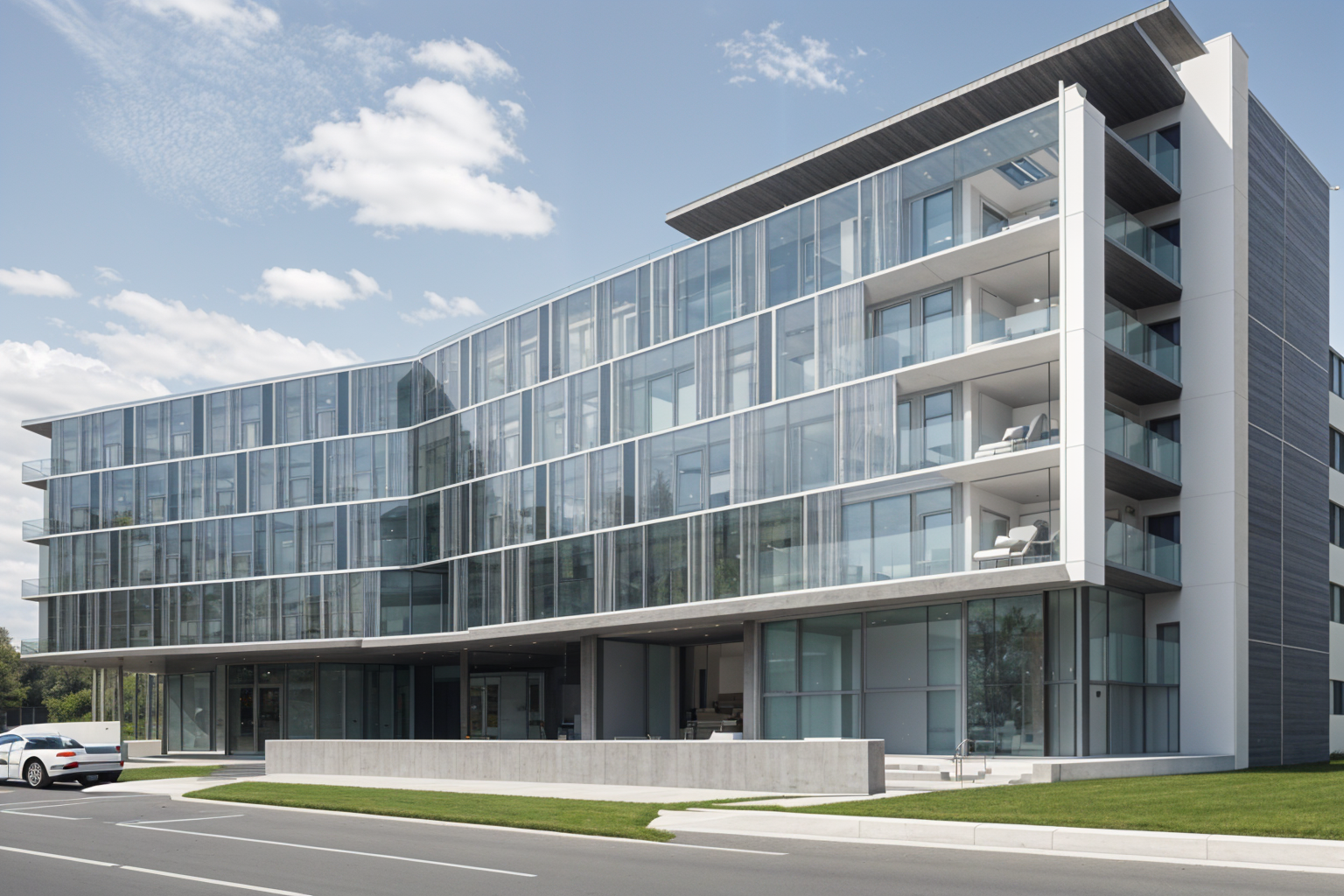 kengo kuma exterior shot a modern five story building with a dynamic wave like facade the structure uses a combination of clear glass and sleek metal panels each floor featuring alternating horizontal and vertical patterns render the building with reflective blue tinted glass windows and light grey aluminum panels the roofline and exterior beams should be a contrasting white set in a vibrant urban setting with a clear blue sky during the golden hour casting warm sunlight and soft shadows add greenery around the base with small trees and shrubs for a lively atmosphere architecture