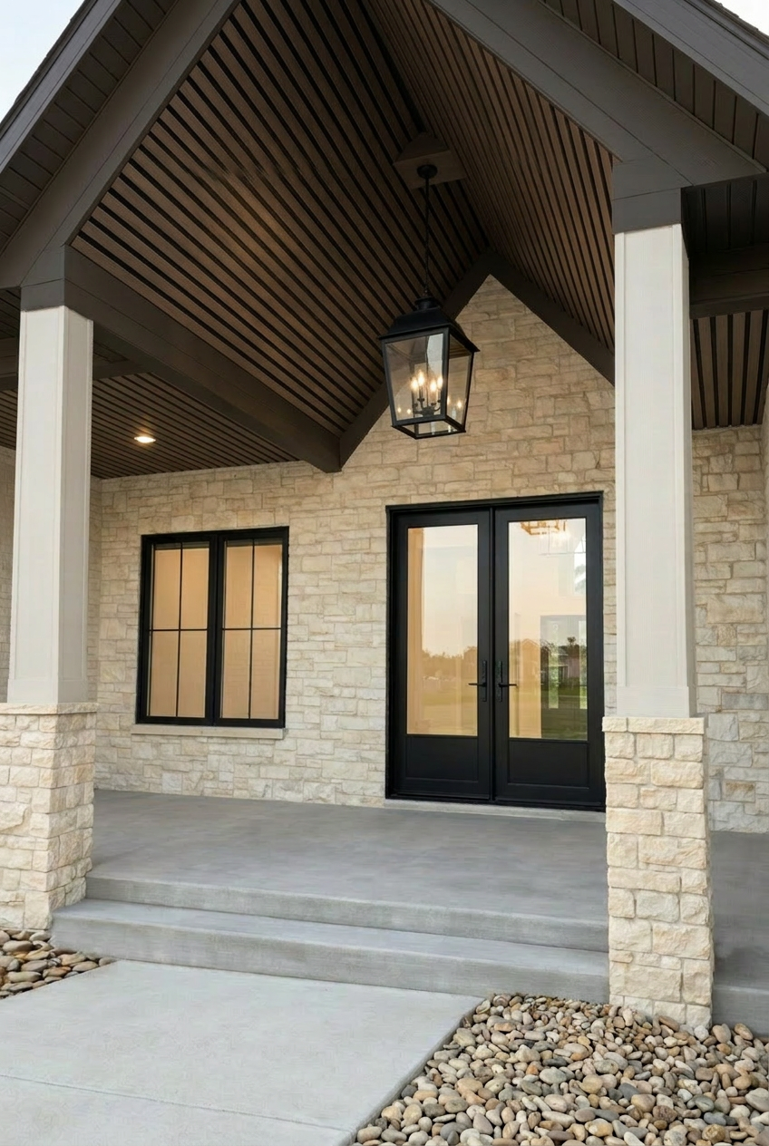 remove the wood and paint it the soffit color makes it more brown charcoal instead of black change the ceiling to a slatted style change the door and window to be black change the slats to be smaller gaps but like siding make the slates wider
