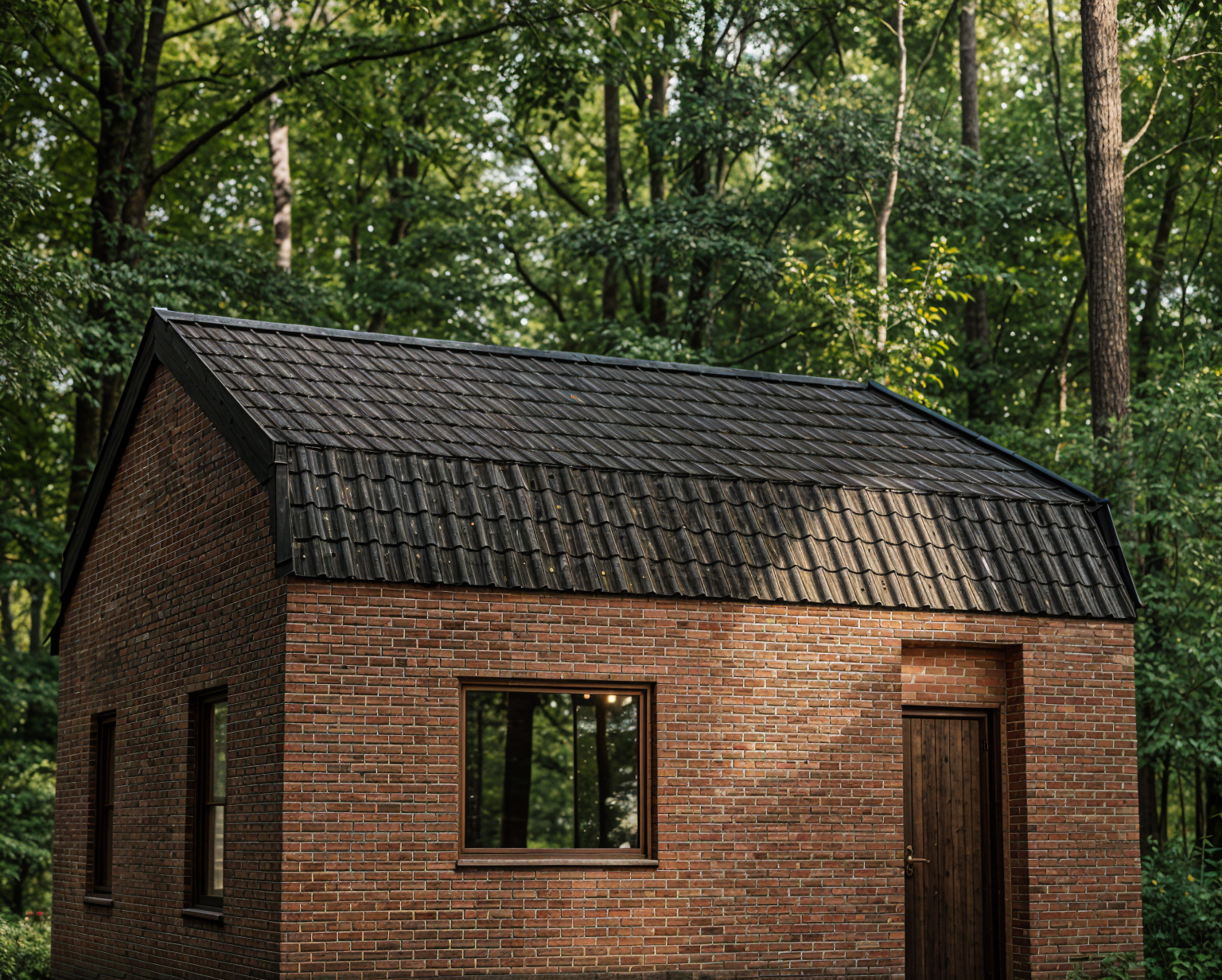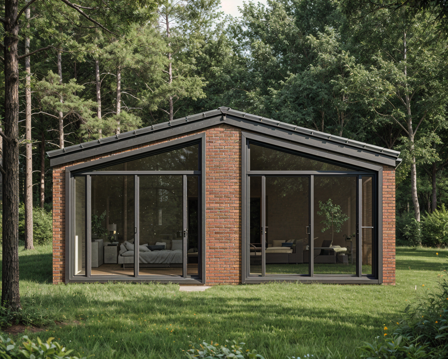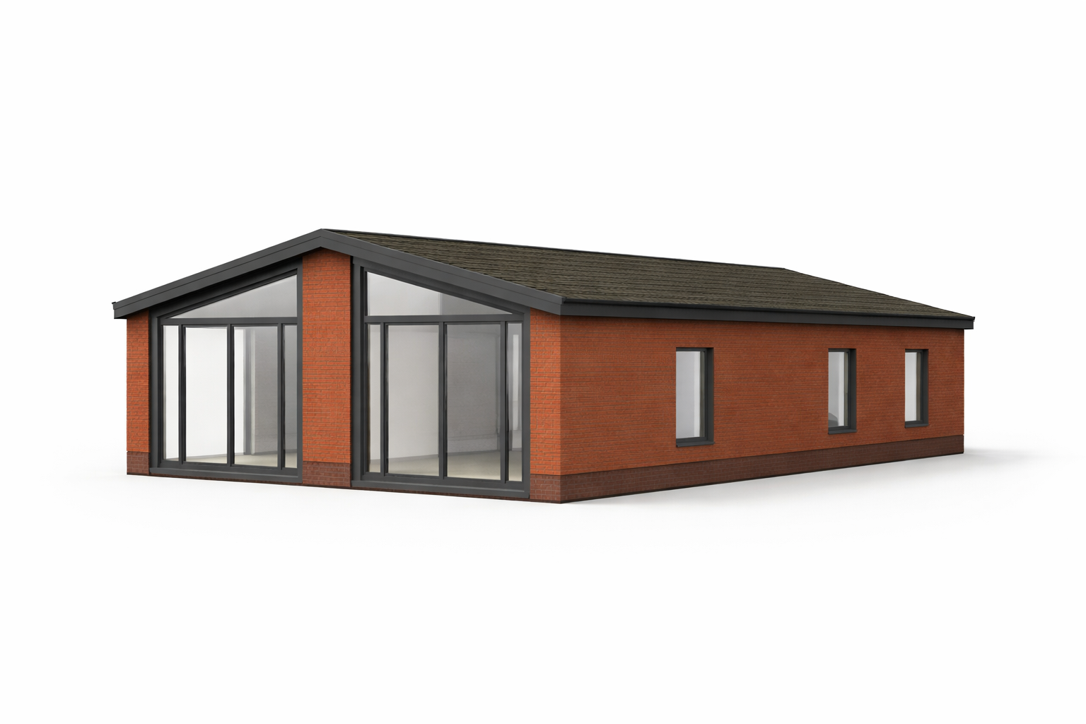 generate a realistic corner perspective 3 4 view of a single family house based strictly on the provided orthographic side elevations preserve the exact massing proportions and roof geometry a low pitch gable roof with dark trim exterior walls finished in red brick with subtle texture on the main facade include large floor to ceiling sliding glass doors with triangular clerestory glazing following the roof slope on the adjacent side facade include smaller vertical rectangular windows matching the positions from the elevations camera at eye level 35 45 mm focal length natural daylight soft shadows neutral plain background semi realistic architectural visualization style clean and minimal scene no environment elements