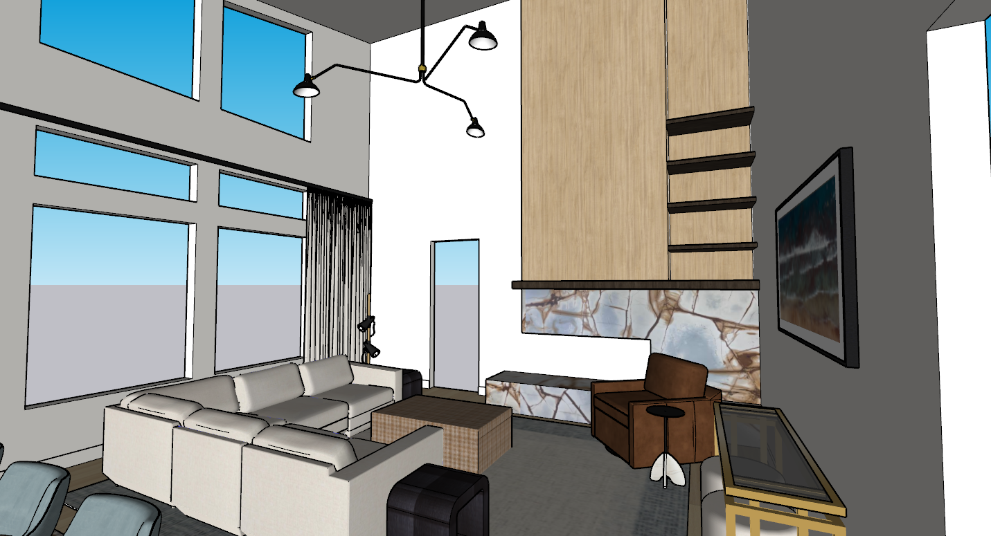render this space being warm and cozy add in a hill scene to the exterior also add a linear firebox in the empty whole where it is suposed to be