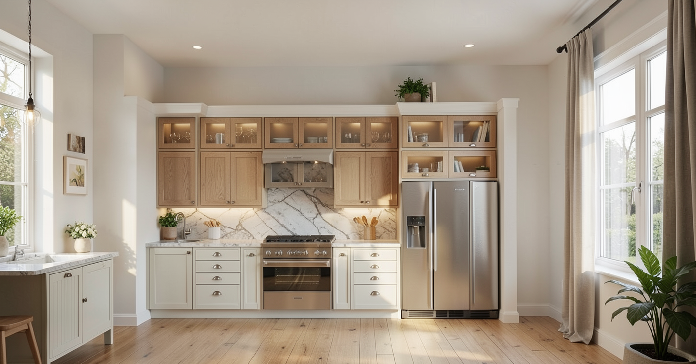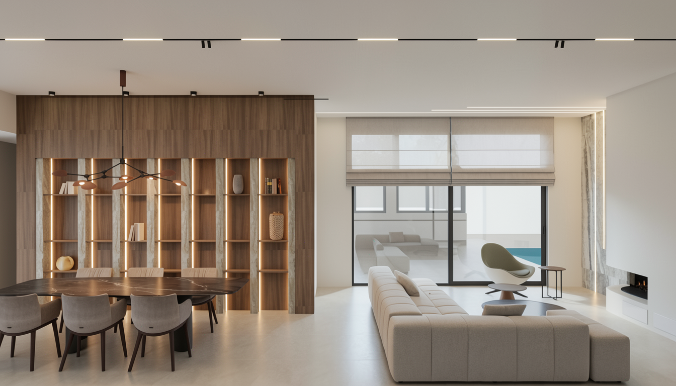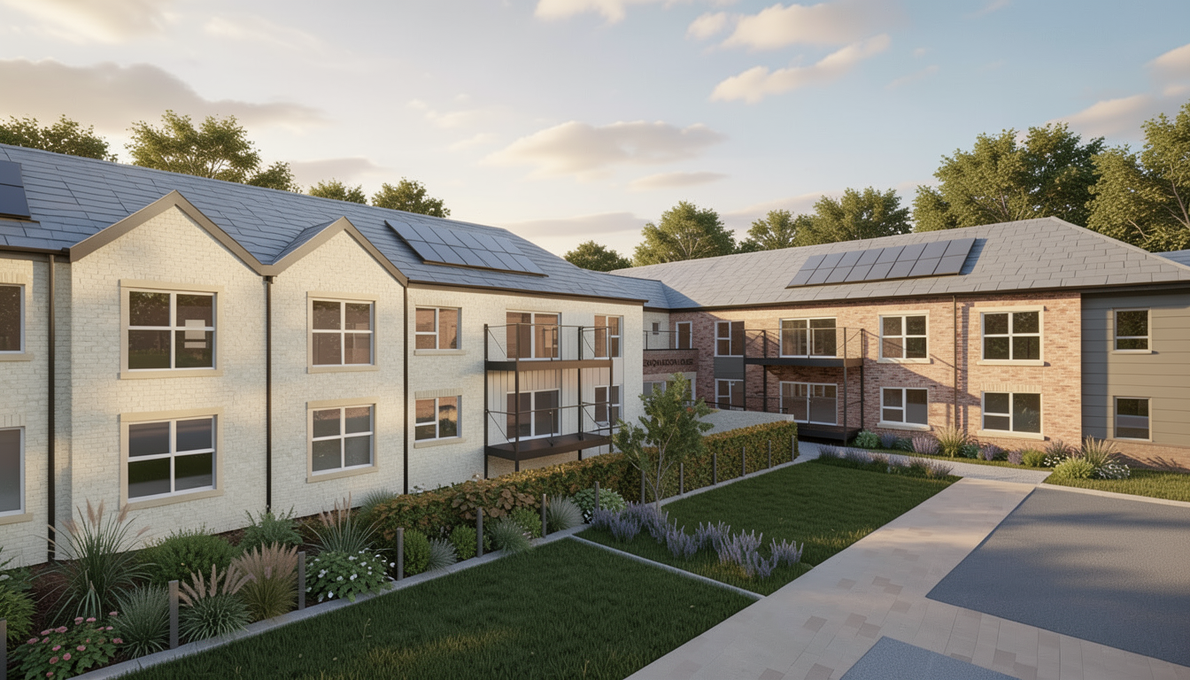 make this render realisitc and enhance it add sky with few clouds slightly warm sun add some soft planting on grass areas make grass realistic add trees to background keep materials the same cream buff common brick where shown beige grey 74685b horizontal standing seam metal cladding where shown solider cream buff common brick where shown cream sandstone widow cills and surrounds where shown grey modern slate roof tiles redish beige bricks where shown solar panels are shown on roof only show grass where shown in image paving is infront of the hedge