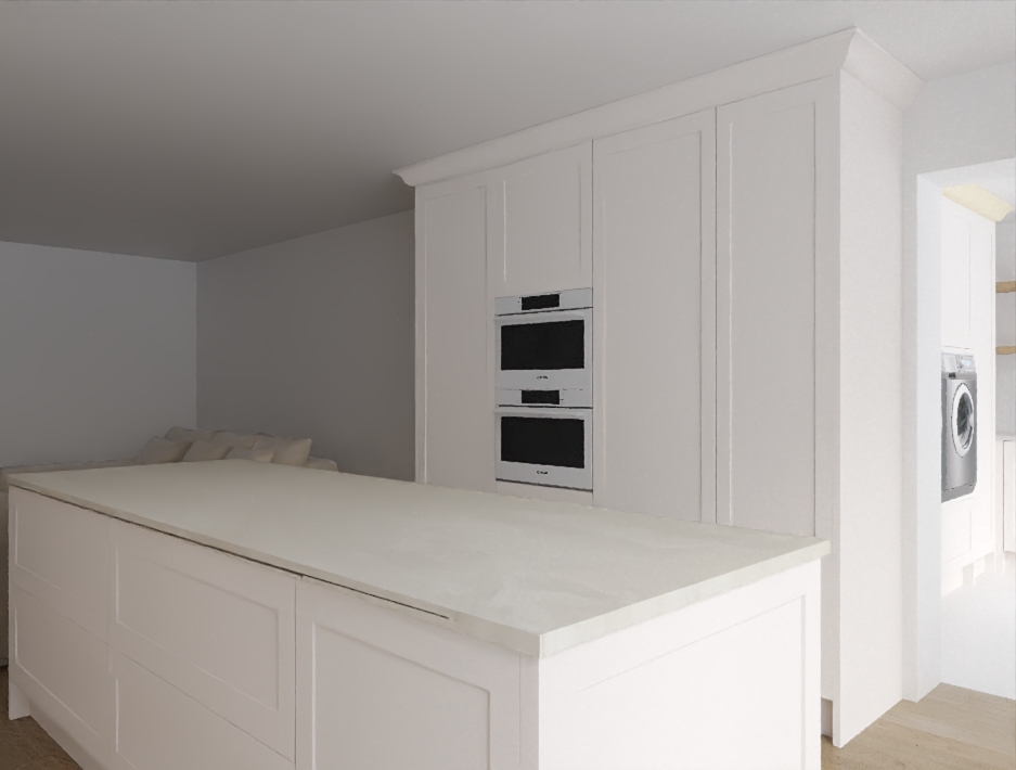 add a vented hob on the island small glass round pendant lights artwork on the wall curtains improve the lighting make the units off white with small dark bronze bar handles add a hob onto the kitchen island add decoration in neutral colours on shelves add a limewash effect on walls make the ovens black