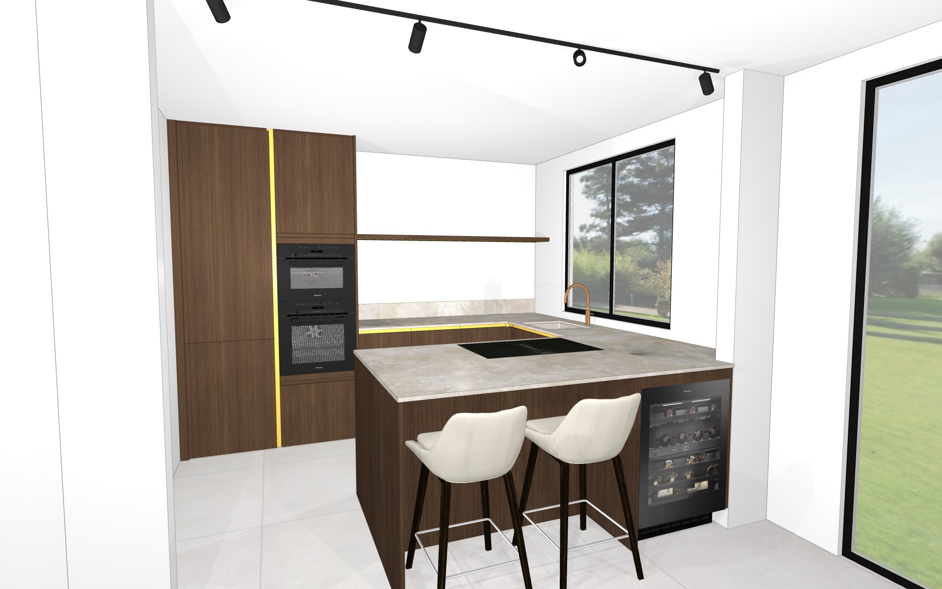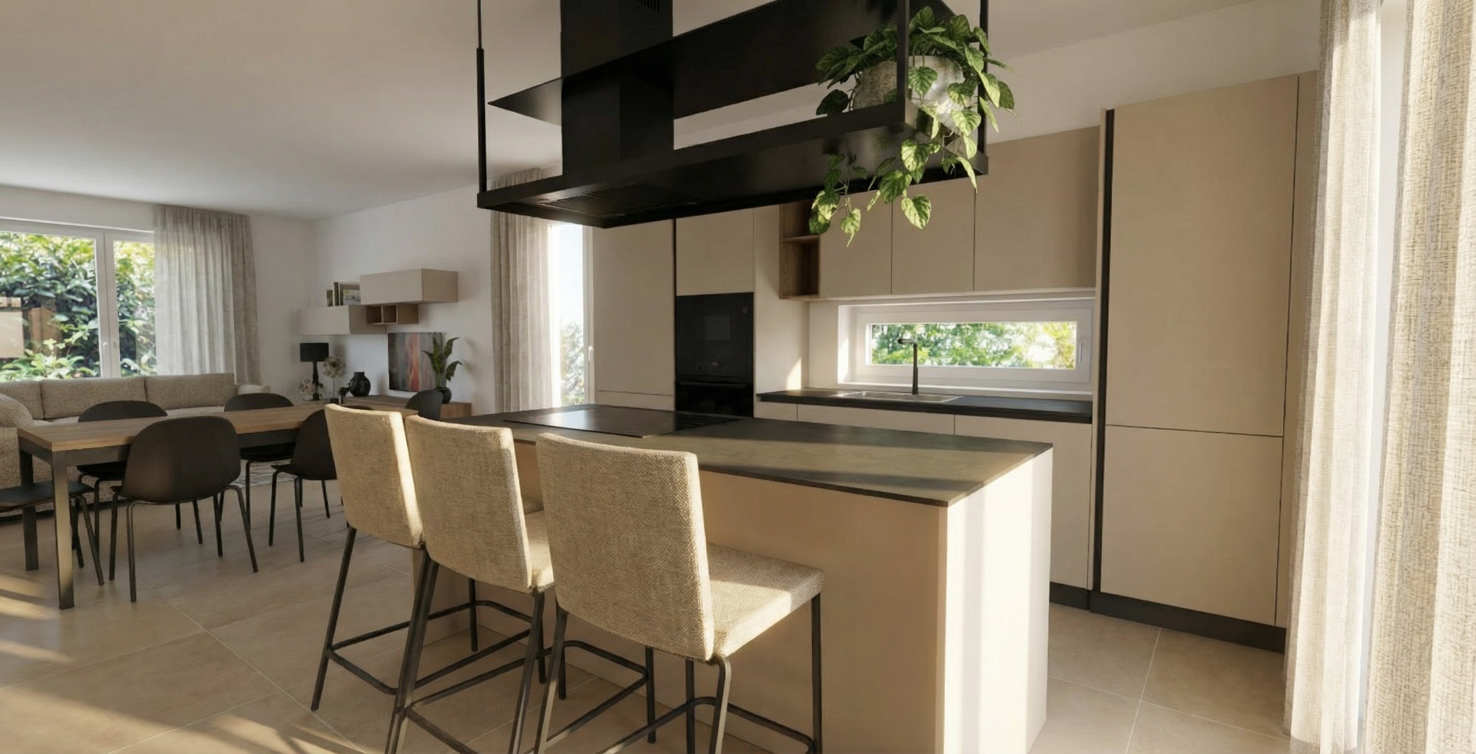 decorate this kichen lighting noon only add a few small elements and keep the direct sunlight subtle