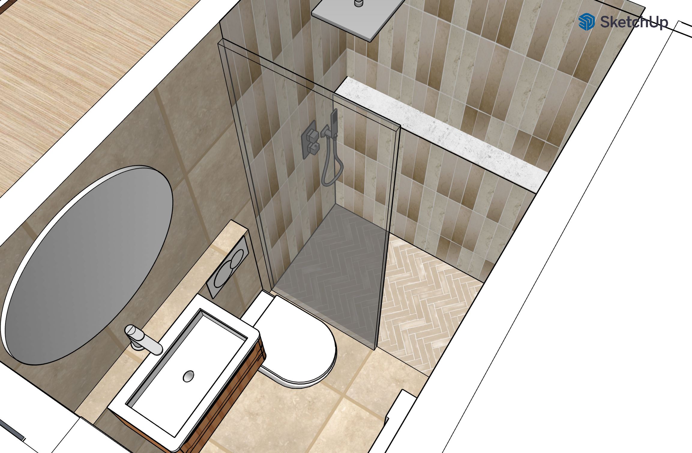 detail shot stone shower floor in herringbone style travertine porcelain bathroom floor beige zelige style wall gloss tiles wall hung wodern vanity unit wall hung toilet wall hung round mirror with led lights behind