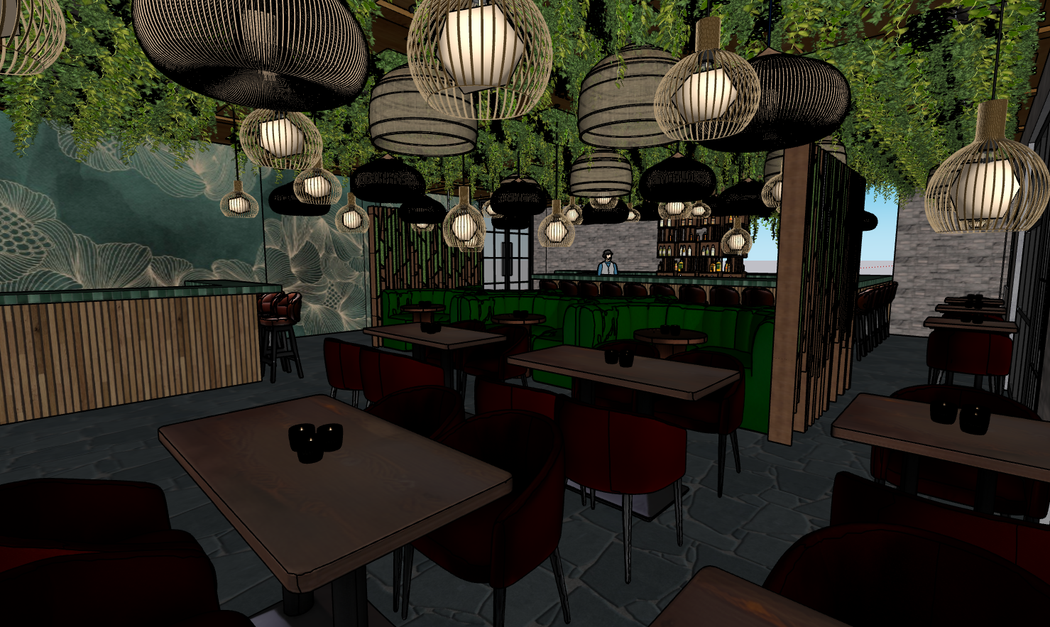 a moody realistic restaurant scene illuminated with dim warm lighting that enhances intimacy while keeping the space comfortably visible gentle highlights fall across stone wood and fabric textures creating a rich lifelike atmosphere