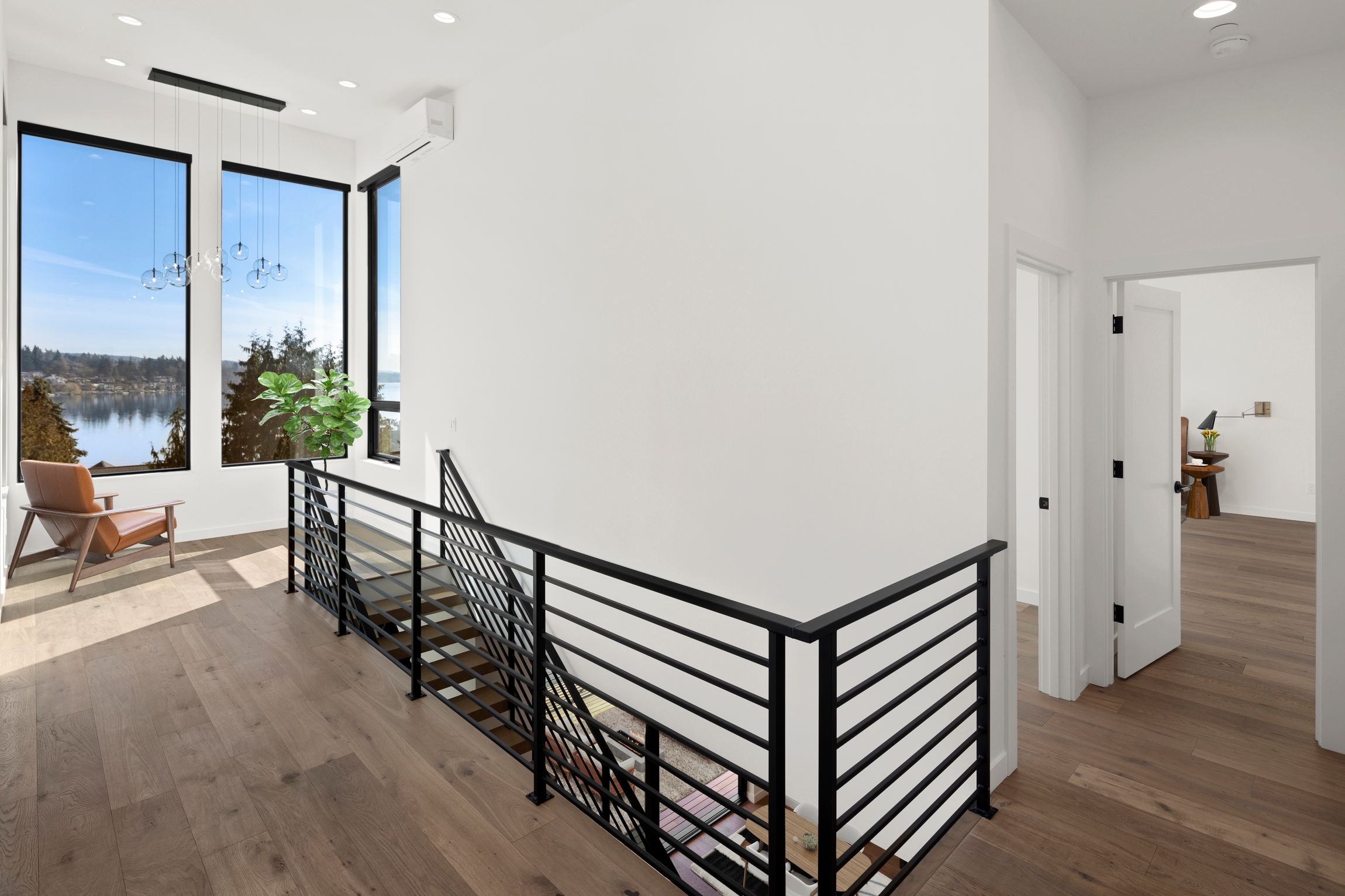 change the plant and the chair to two comfortable lounge chairs and a side table by the large windows