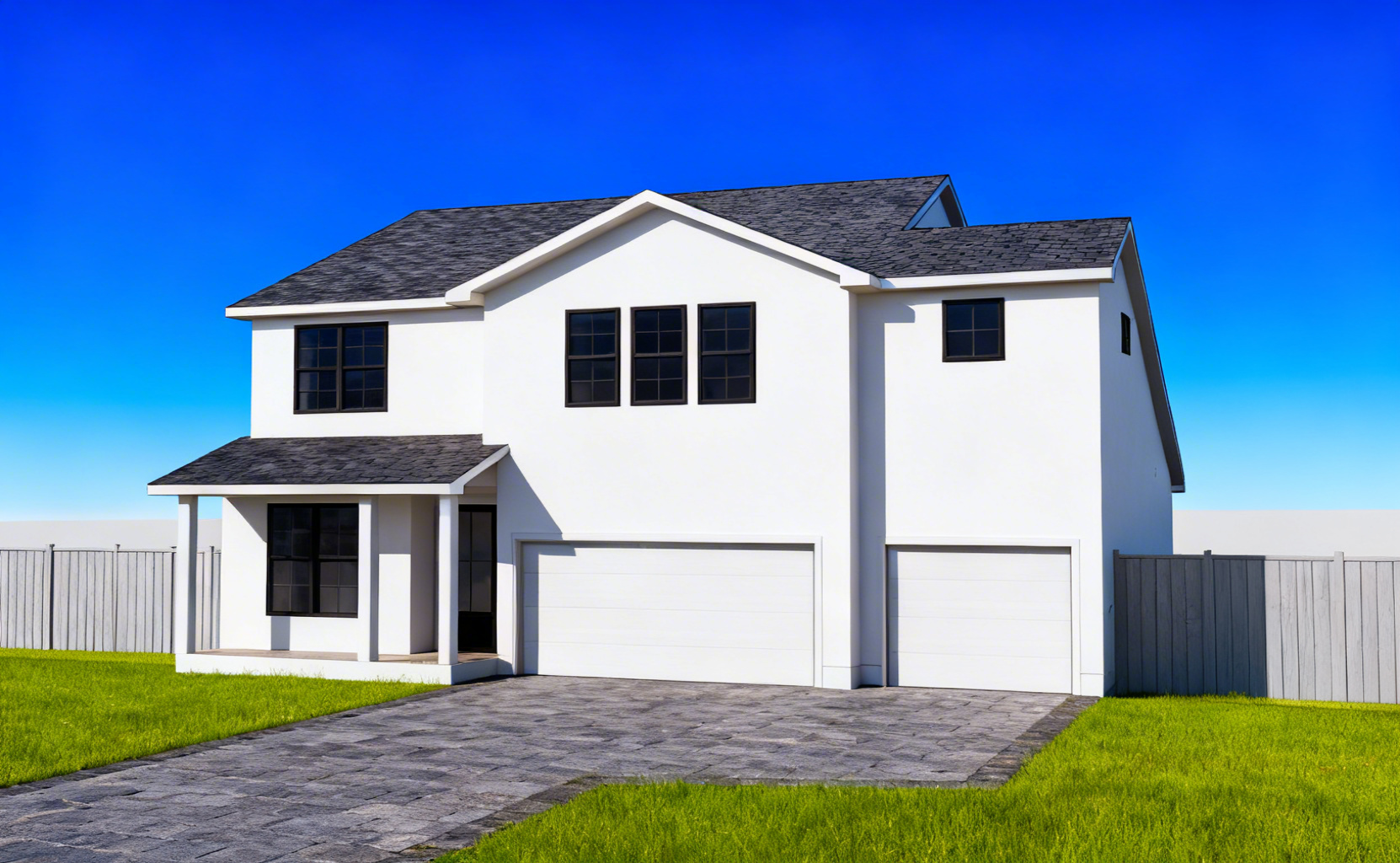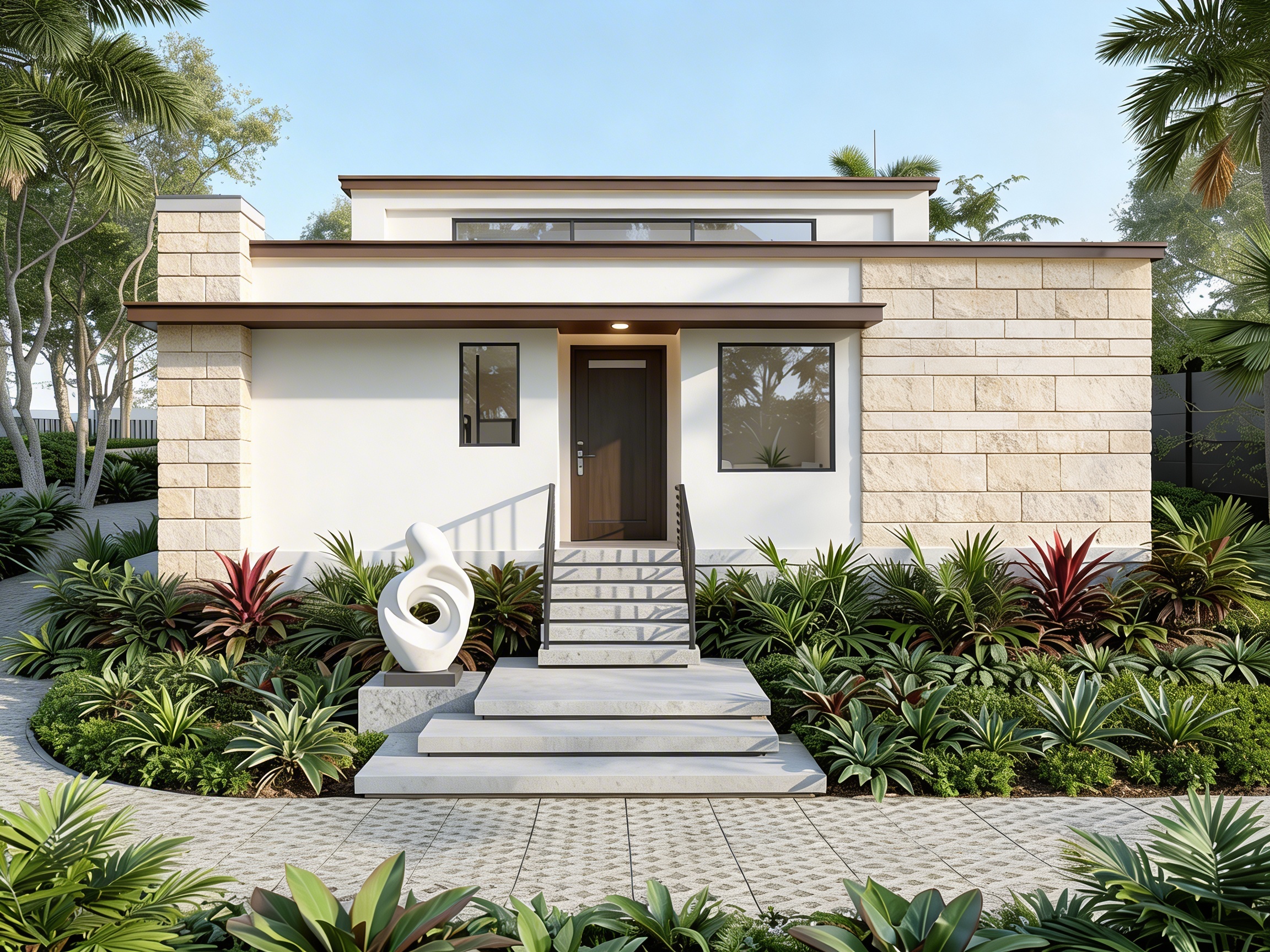 convert this exterior rendering to a warm miami dusk sunset atmosphere keep the architecture stone placement stucco walls windows landscaping sculpture stairs and camera angle exactly the same change only the lighting and sky use a soft tropical dusk sky with subtle orange pink and purple tones fading into blue add warm exterior lighting the porch ceiling light glowing warmly subtle warm light around the entry gentle landscape lighting illuminating plants the limestone should catch warm sunset highlights while the stucco stays softly shaded create realistic dusk lighting with long soft shadows and a calm tropical evening mood photorealistic architectural visualization natural global illumination cinematic dusk lighting luxury real estate render quality