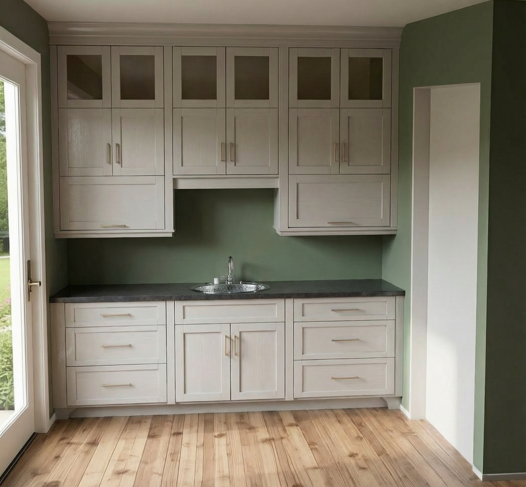 create a hyper realisitic visual make the background more sylvan and add some planting to the central green area and make the centre a little wile planted pond dont change the perspecxtive of angle of view or design