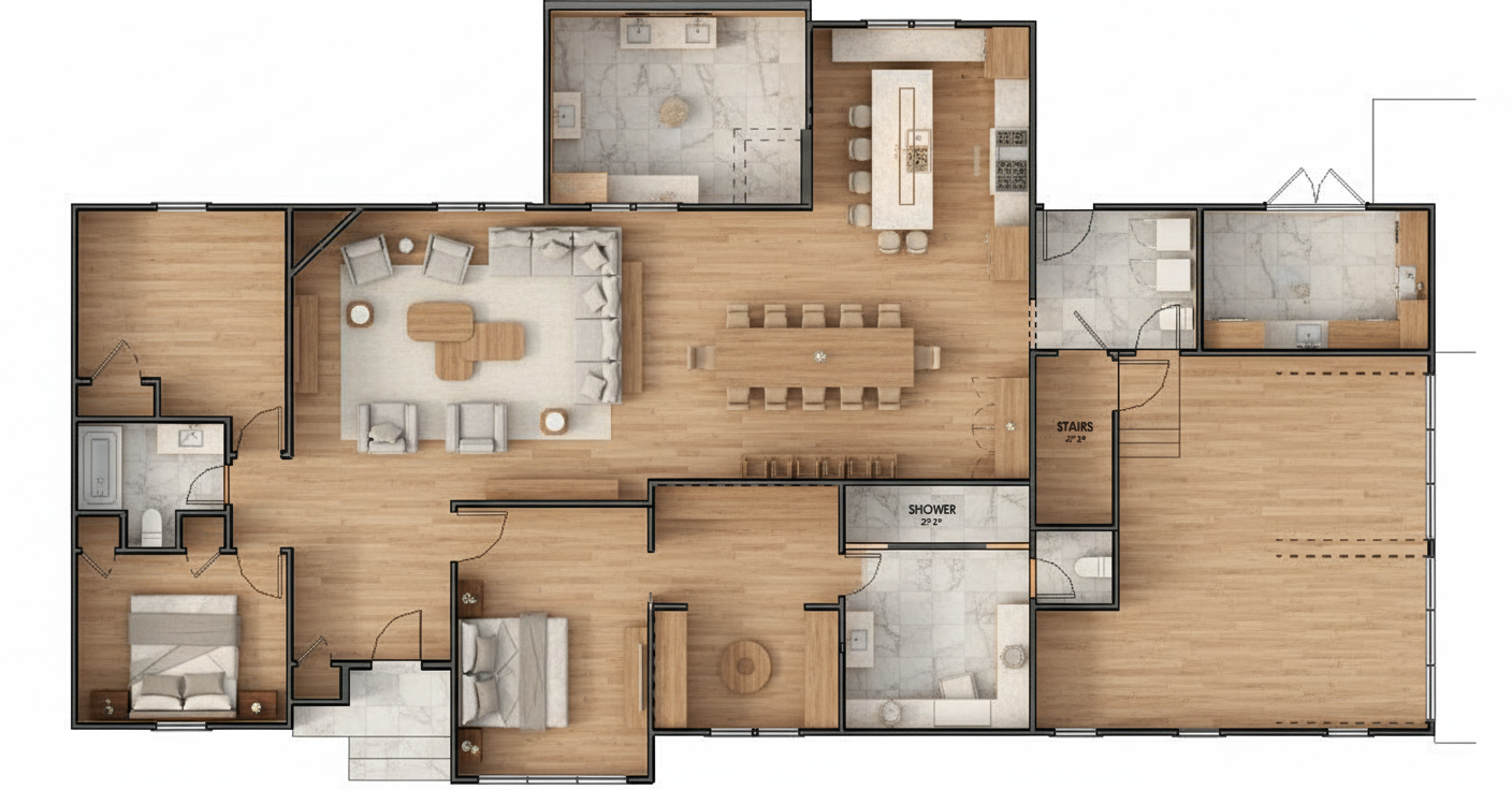 keep the same room layout and composition but redesign all materials with a futuristic aesthetic replace surfaces with glossy panels glass and high tech composites introduce subtle neon or led lighting integrated into the architecture clean minimal and sleek design with a high tech atmosphere