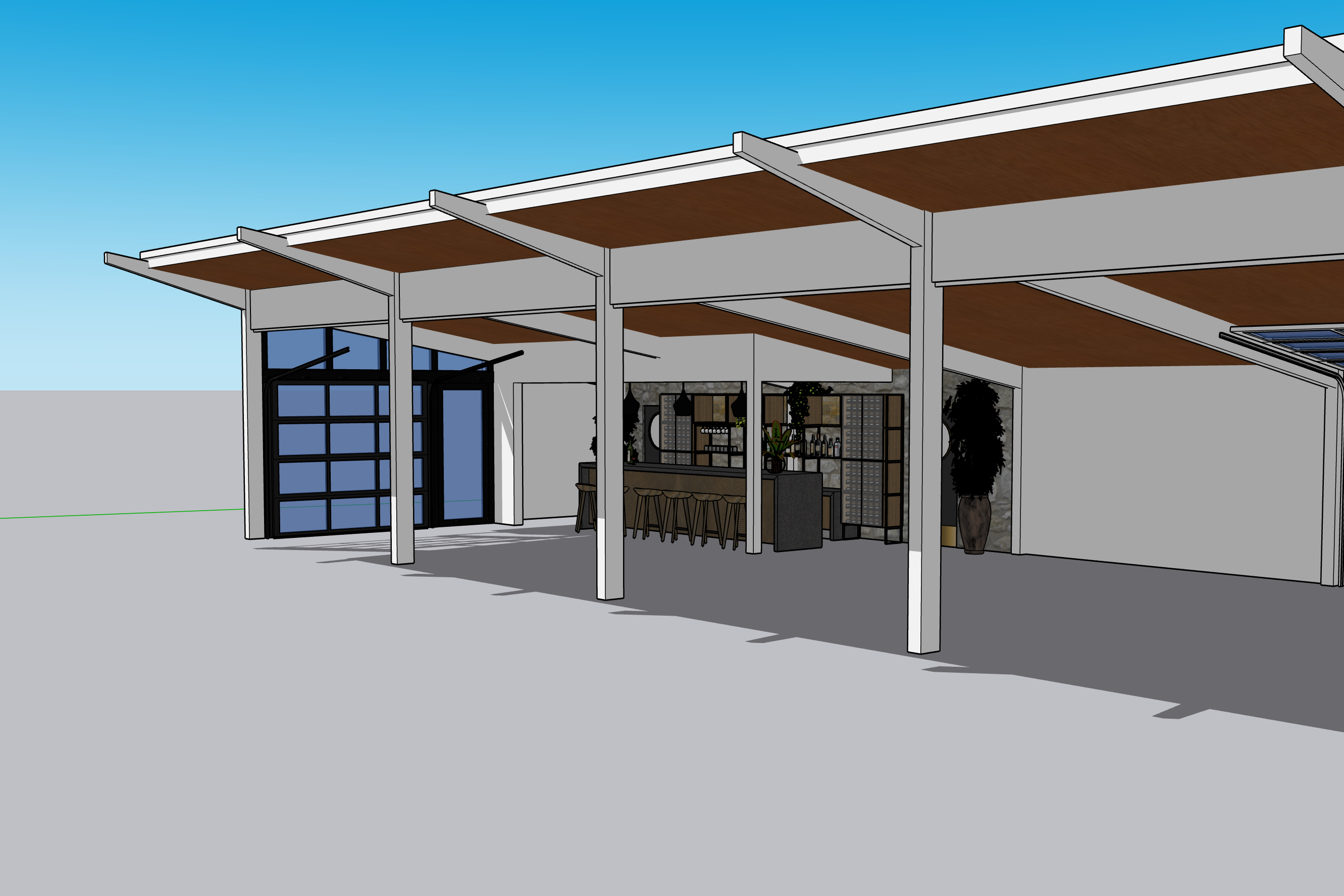 modernist perspective shot exterior perspective looking into the building toward the west end positioned just south of the structure at the edge of the driving range where the grade drops away immediately beyond the open bays the entire south fa ade is composed of open air bays all of which admit abundant natural light into the interior this creates a continuous wash of daylight across the full width of the space with soft late day sun casting long horizontal shadows that articulate structure furnishings and floor texture additional daylight enters from a glazed overhead garage door on the west wall providing a secondary directional glow that draws the eye deeper into the lounge bar area and creates layered light conditions the left two bays are occupied by a lounge bar program the bar is positioned to receive and reflect both the southern and western light emphasizing material richness wood stone and metal surfaces subtly illuminated seating groups are distributed within this field of daylight with overhead lighting and ceiling fans adding a warm ambient layer beneath the structure to the right two active golf simulator bays are visible though still open to the south and receiving natural light these bays are visually differentiated through slightly more controlled lighting screen illumination and subtle architectural framing the simulator areas feel energetic and social with small groups engaged in play the transition between lounge and simulator zones is legible through light modulation and spatial cues rather than enclosure maintaining openness while expressing distinct program beyond the open bays the terrain drops away immediately into the driving range extending views outward toward woodland hills golf course and anchoring the interior experience within its landscape setting architecture
