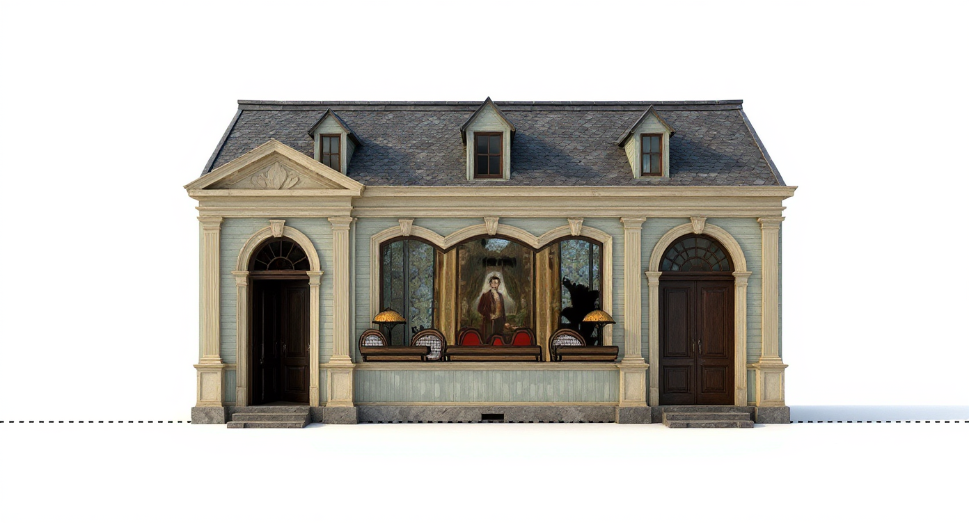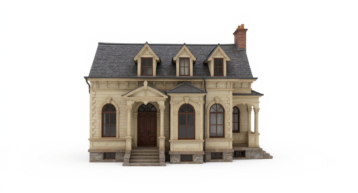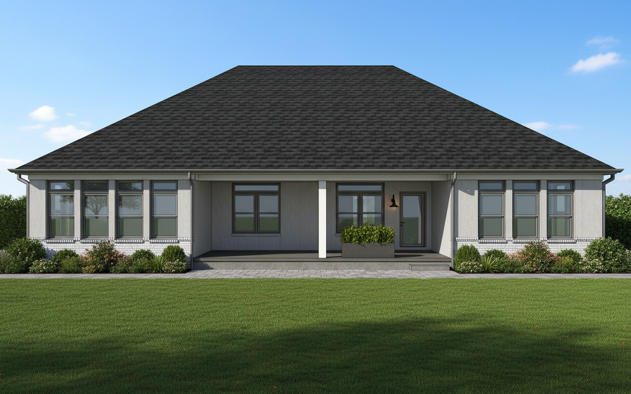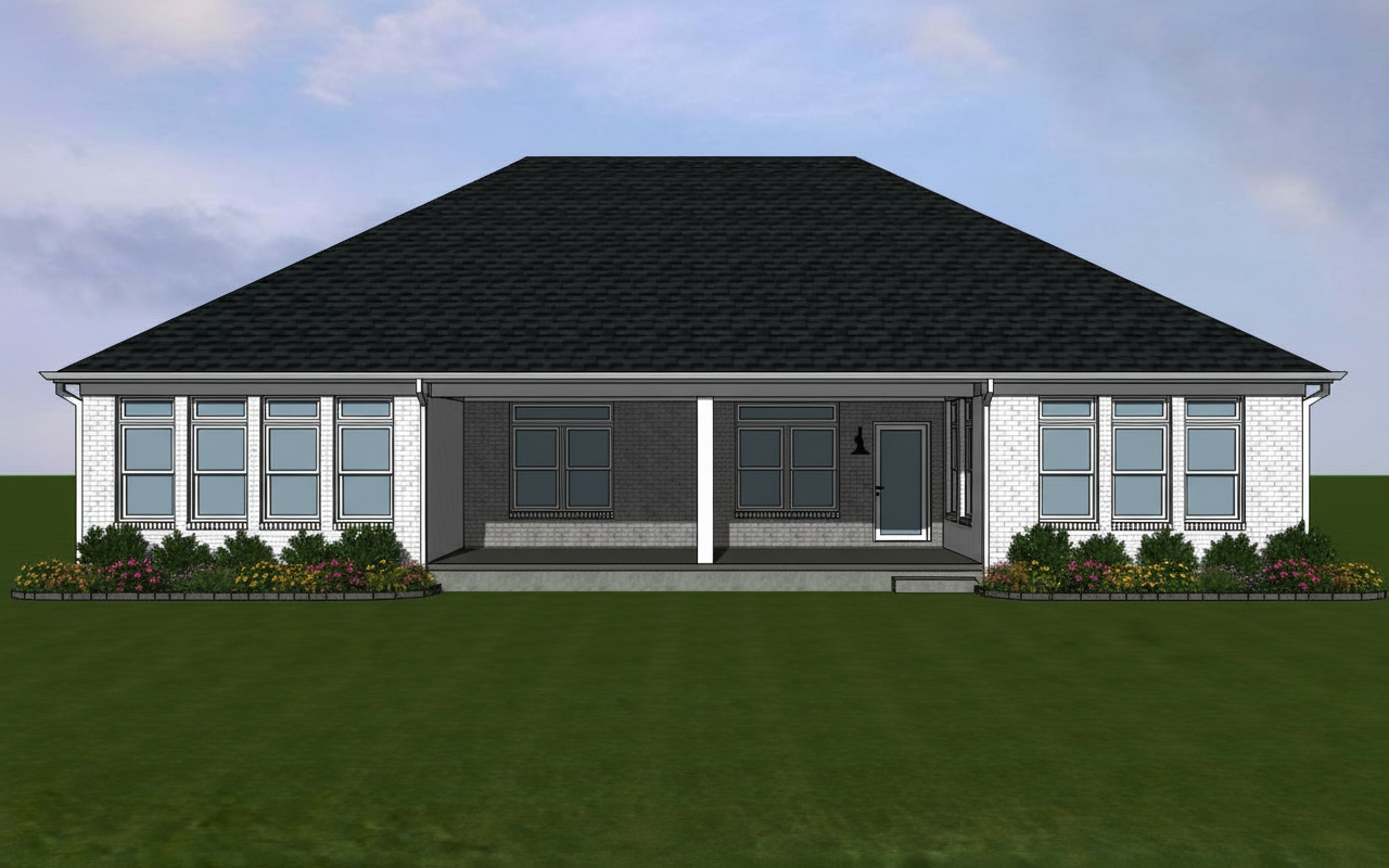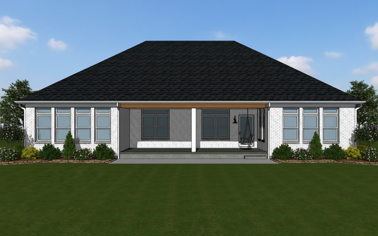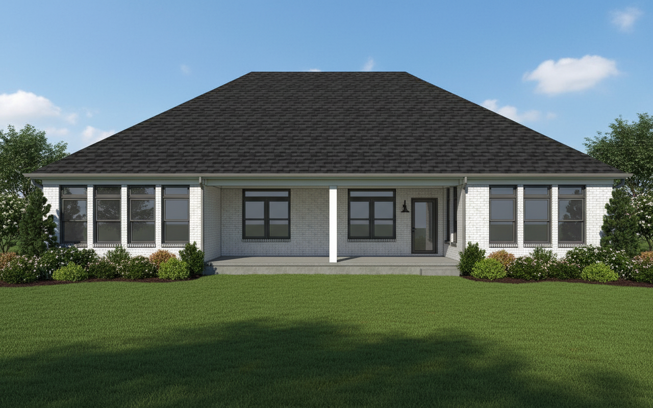 black shingle roof weathered white brick white window frames white downspouts and gutters no porch swing realistic rendering