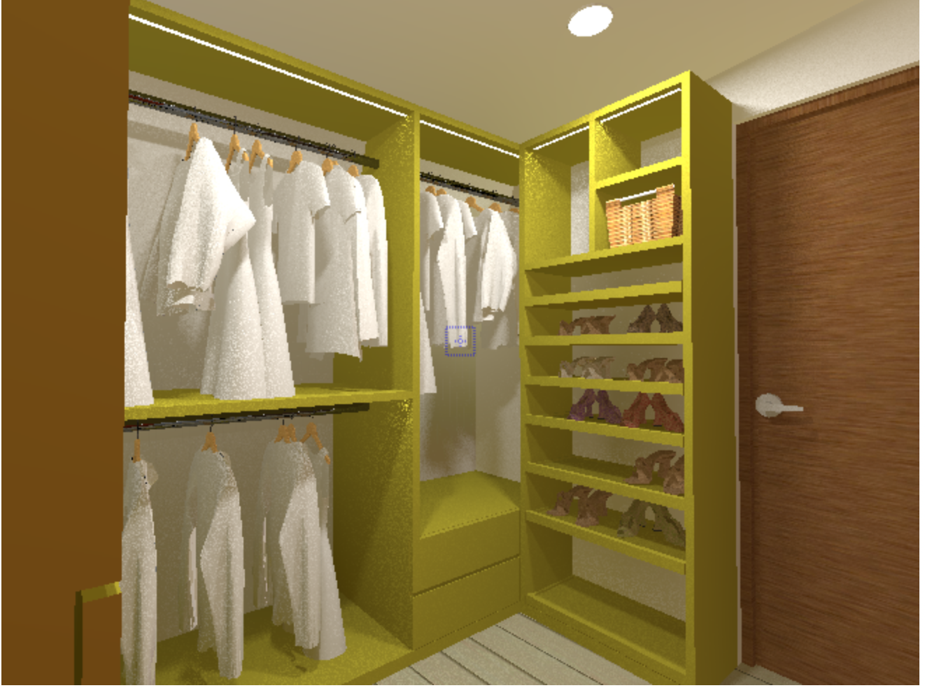 create a photorealistic 3d image of a closet made of american walnut wood the drawer fronts are made of patchwork with hidden handles there is indirect lighting on the shelves a sliding shoe rack in american walnut wood and the closet is decorated with clothing women s shoes in the shoe racks and bags and folded clothes on the shelves
