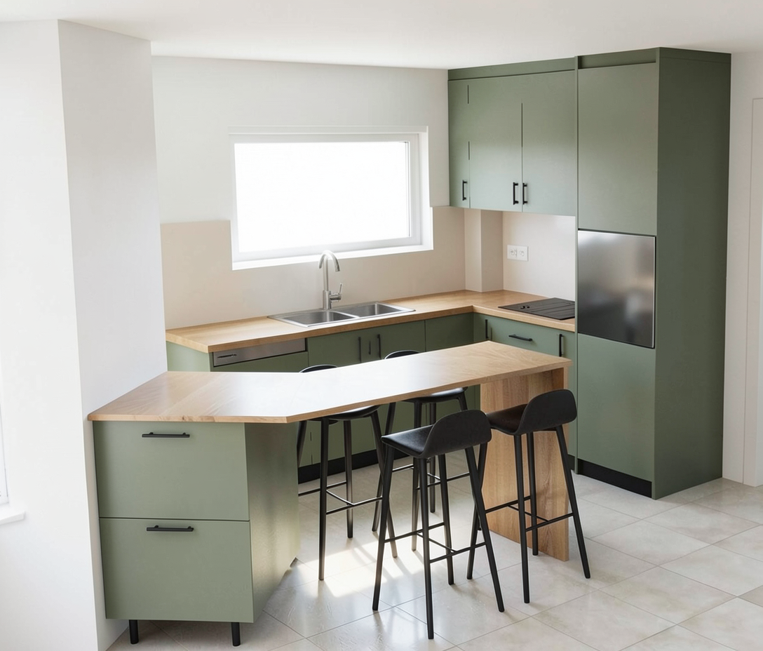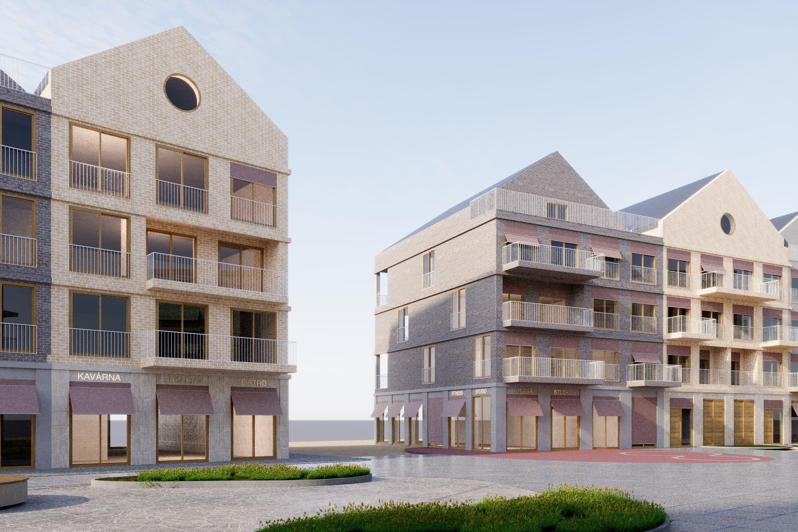 contemporary european residential urban block calm parisian swiss housing atmosphere soft sunlight with long shadows warm fa ade illumination contrasting with cool sky tones photorealistic architectural photography style natural material realism with subtle imperfections slightly varied brick tones micro roughness variation softened edges light weathering near ground level and slab joints lively but calm urban life a few people walking sitting at caf terrace edge of the left building bicycles minimal street activity open ground floor commercial spaces with warm interior lighting curtains and furnished apartments visible behind glazing right corner is a fitness studio there is a minimalistic outdoor playground on the pink surface realistic paving with tonal variation and wear patterns planted areas with irregular vegetation soft reflections on ground surfaces atmospheric depth with slight haze reduced background contrast cinematic exposure natural lens perspective architectural photography composition foreground framing elements in the back in between the buildings there is greenery mood quiet refined contemporary european housing development understated luxury nicolas dorval bory paris housing competition atmosphere believable lived in environment not glossy visualization