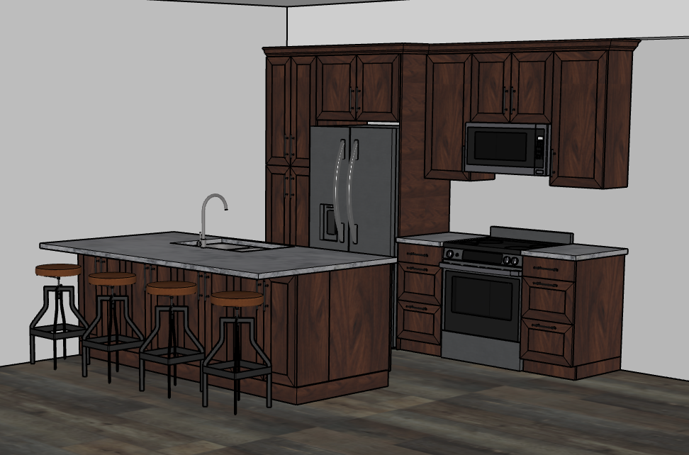 this is a beautiful kitchen with cabinets made of natural stained walnut the handles are all a matt black all appliances are a modern stainless steel the countertops are a beautiful white marble the flooring is a nice modern medium light rustic lvp flooring this kitchen has lots of natural light coming in from behind the camera the cabinets go up to a soffit in the ceiling that drops down about 14in the peninsula buts right up to the wall on the left