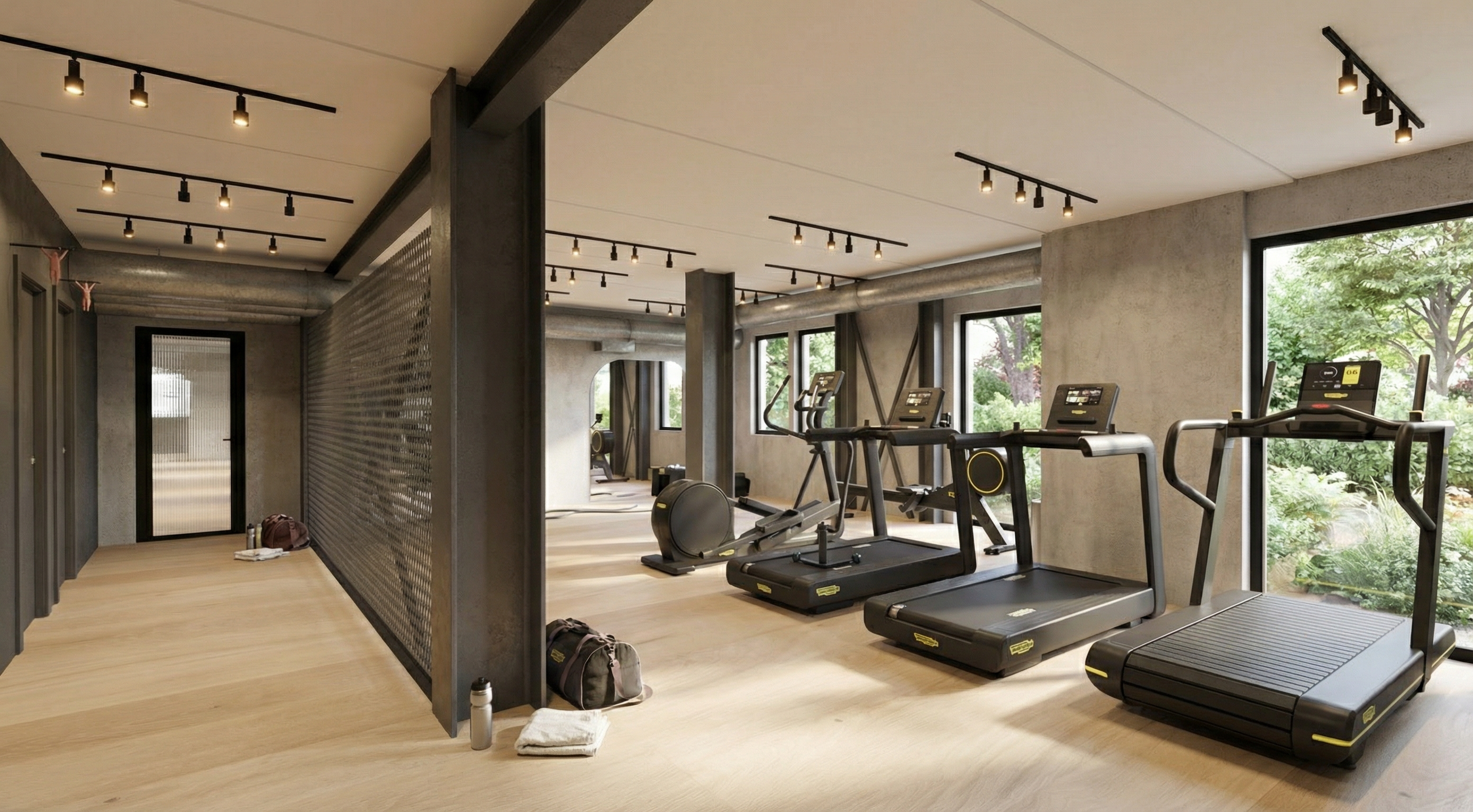 e una palestra a terra abbiamo un pavimento in parquet in rovere chiaro continuo a liscio le pareti e il soffitto sono bianchi non ci sono strip led come illuminazione come illuminazione abbiamo dei binari con faretti a luce calda fai entrare un p di luce naturale e metti uno sfrondo esterno con pavimento vicino a finestre e qualche albero metti qualche oggetto come zaini palestra attrezzi e borracce