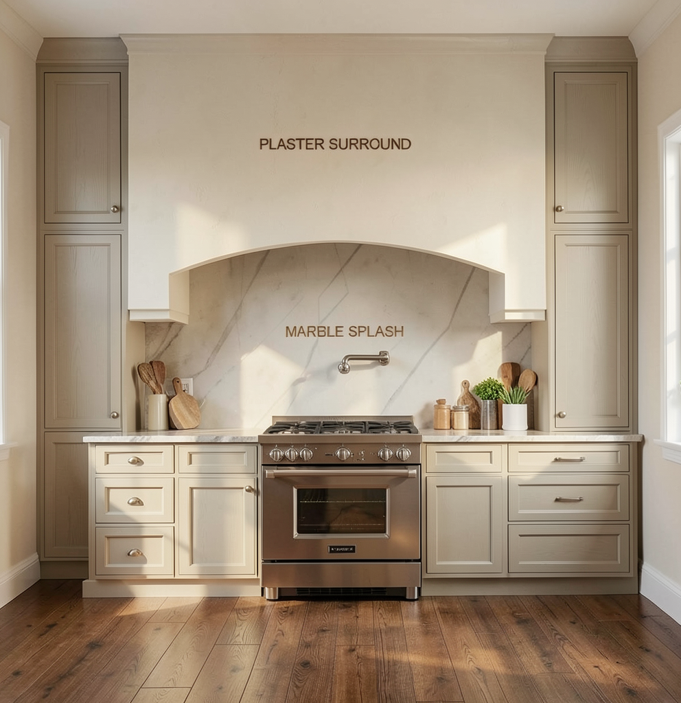 kitchen with plaster alcove brown wood floors