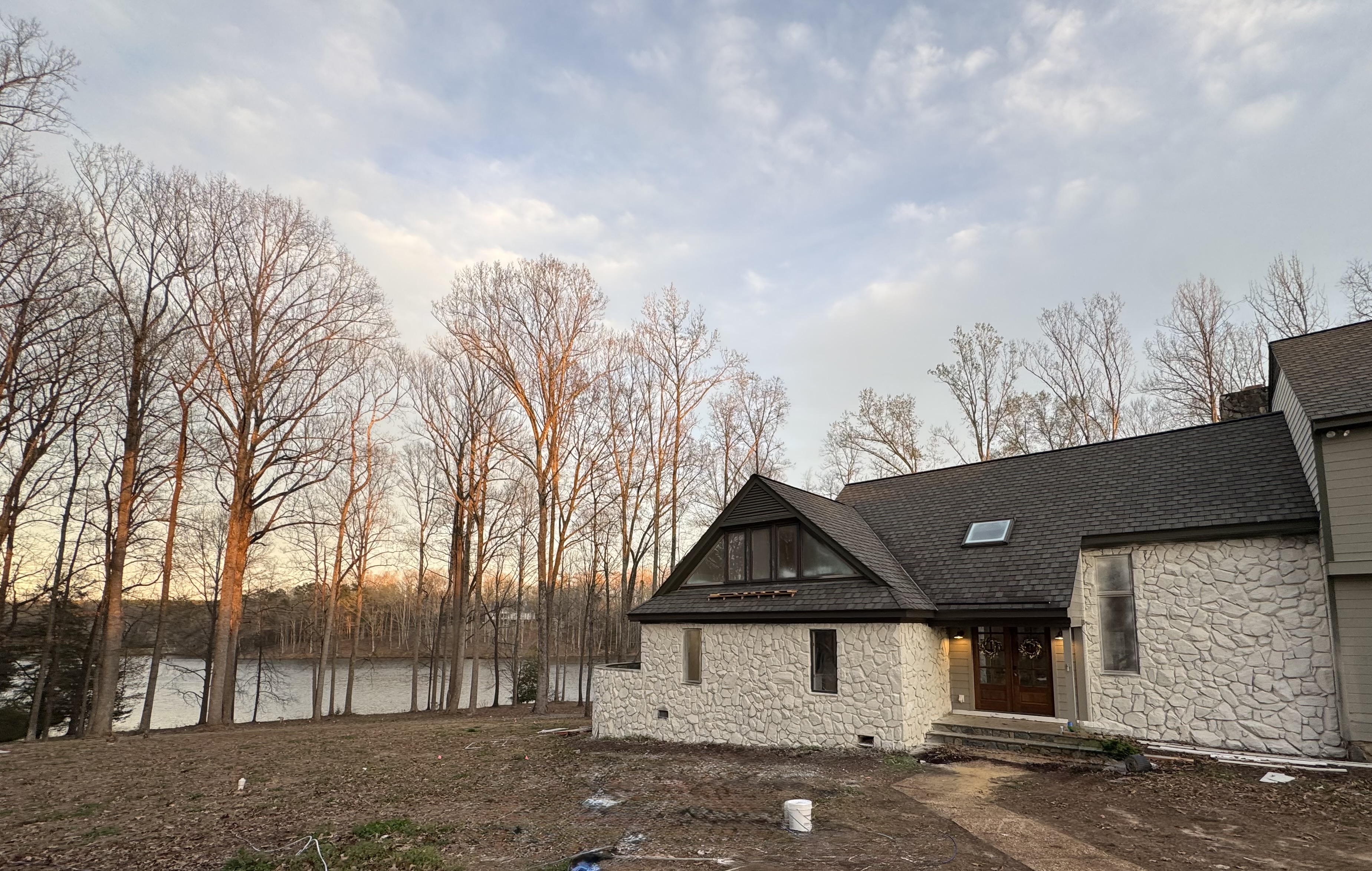 project type exterior enhancement rendering photorealistic instruction priority strict do not alter structure base image input use the provided photo as the exact base reference maintain 100 accuracy of the house structure rooflines windows doors limewashed stone finish siding colors proportions and perspective the house must remain completely unchanged primary objective enhance the surrounding site conditions only transform the yard and landscaping into a high end fully finished luxury lakefront property presentation site landscape enhancements replace all bare dirt with lush dense deep green turf grass fresh sod look perfectly established add natural grade smoothing and subtle contouring to eliminate rough construction terrain create a clean edge transition between lawn and planting beds foundation landscaping whitestone perimeter install layered high end foundation plantings including low structured evergreens boxwoods or similar mixed ornamental shrubs with variation in height and depth soft flowering accents white muted greens keep palette refined add dark brown black mulch beds with crisp clean edges integrate natural stone or steel edging subtle modern not decorative heavy accent elements add strategically placed landscape boulders natural not oversized introduce ornamental grasses for movement near corners transitions lightly enhance the approach to the front entry with clean elegant planting symmetry hardscape touch ups minimal refine the front walkway visually clean edges slightly upscale appearance brushed concrete or natural stone feel do not redesign layout only enhance realism and finish quality lighting add subtle warm landscape lighting low voltage uplighting on stone fa ade soft tree uplighting toward lake side path lighting along entry walk minimal elegant spacing background setting preserve all existing trees and lake exactly as shown slightly enhance water reflection and sky warmth for a luxury golden hour feel clean up any construction debris or imperfections in the yard style direction high end custom home lakefront luxury aesthetic clean natural not over designed think 2m finished property presentation render quality photorealistic natural lighting and shadows no artificial or cgi looking elements maintain correct scale and proportions of all added landscaping critical rule do not modify the house in any way no changes to materials colors windows doors roof or structure only enhance the surrounding landscape and site
