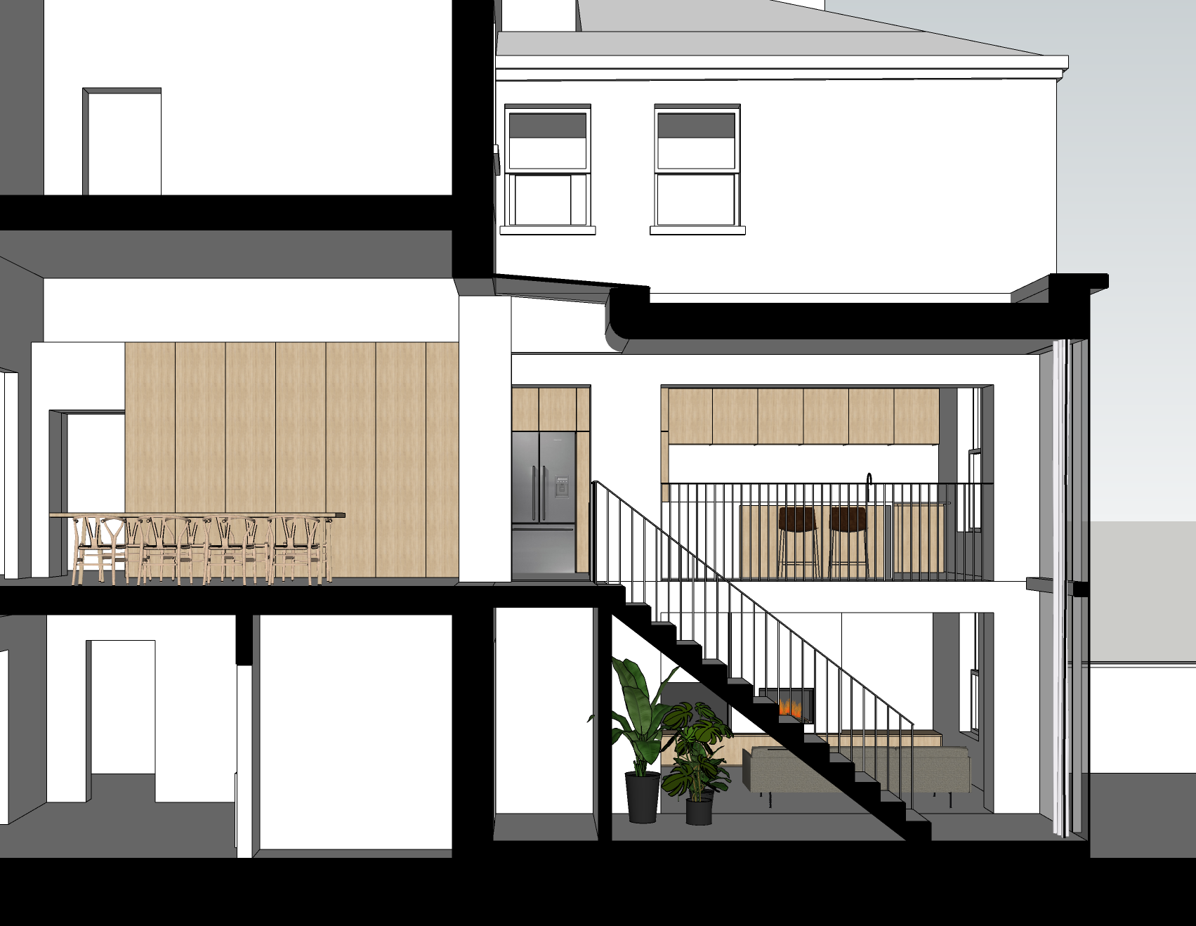 create a serene atmospheric perspective image with soft diffused lighting and minimal reflection the whole image is very light with lots of natural daylight inside the spaces there are feature items of joinery with matt pale oak panels and a pale oak kitchen a rooflight along the back of the building brings lots of natural daylight into the spaces the quality of the image is ethereal almost appears like an illustration with soft lighting and slight haze