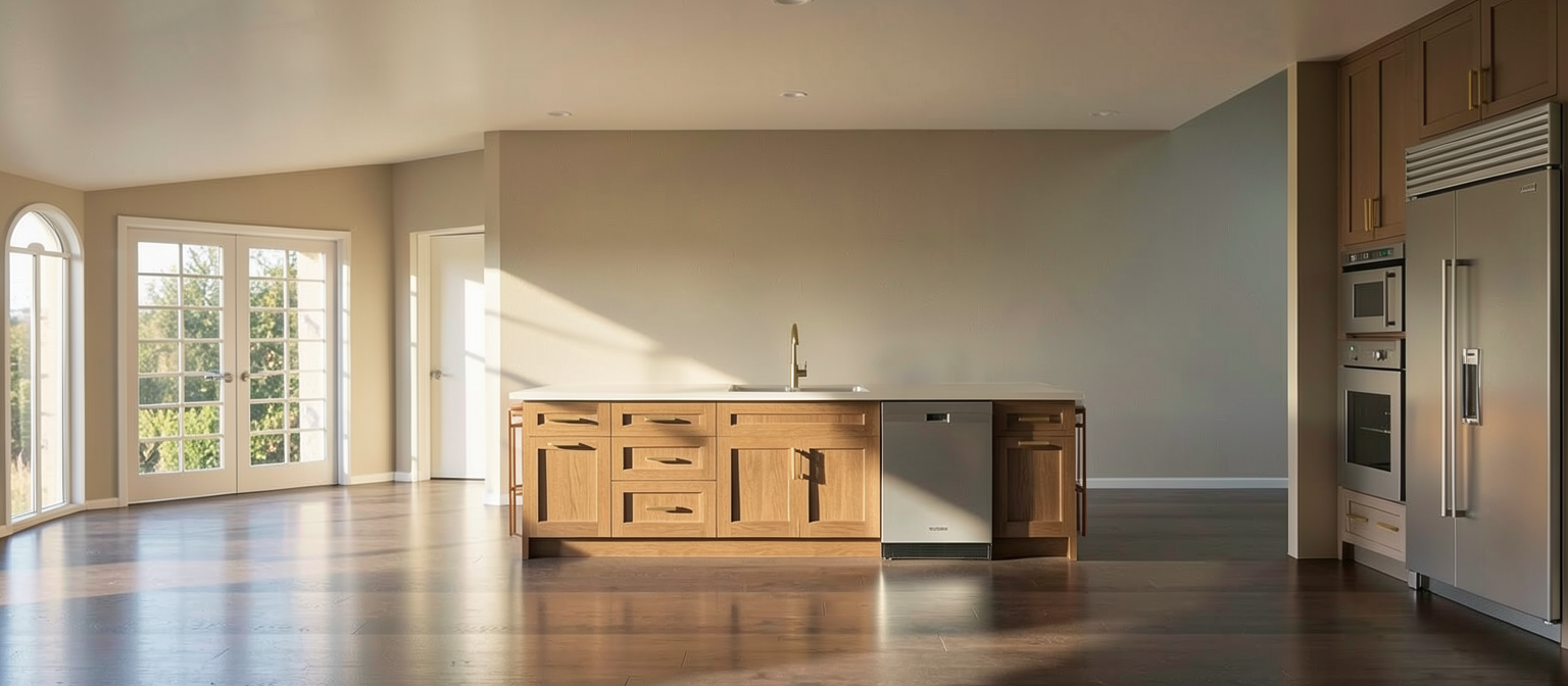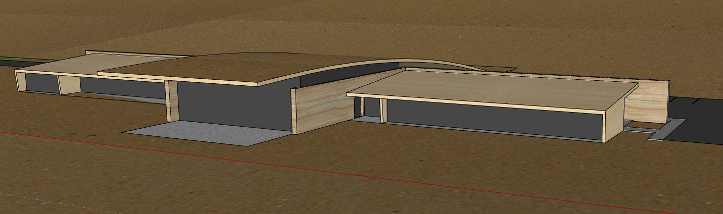 can you render the attached image the materials are to be rammed earth green vegetated roof in a dry climate over the main curved roof the roofing is to be galvalume metal seam roofing with cedar siding can you add dynamic columns supporting the overhang