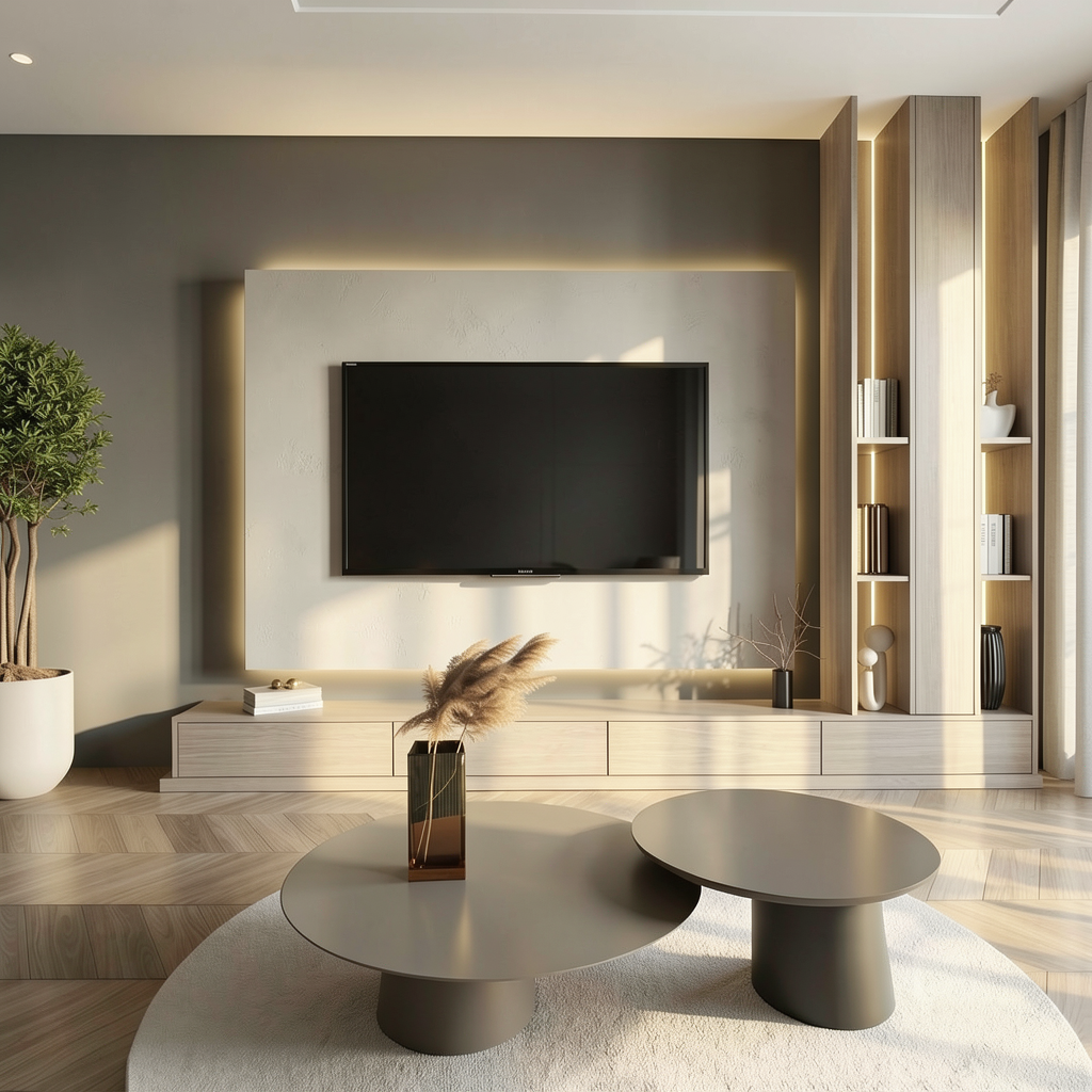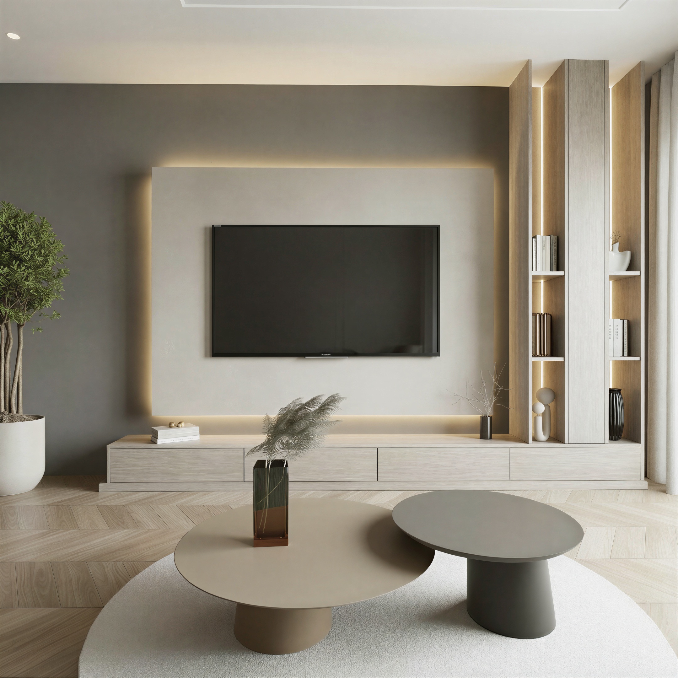 keep the exact same design layout tv wall composition furniture dimensions shelving structure coffee tables camera angle perspective curtain placement floor pattern and overall scene do not redesign anything and do not move or replace any elements change only the materials and finishes match the materials to the uploaded reference image exactly the wood on the tv console drawer fronts shelving interiors shelving side panels vertical elements and all joinery must be a warm smoked taupe oak veneer not pale oak and not creamy beige wood the veneer should have a soft brown grey undertone slightly muted elegant refined with subtle natural linear grain low to medium contrast and a premium matte finish the wood tone should feel warmer deeper and more sophisticated close to the reference image with a luxury contemporary look avoid yellow oak pale scandinavian oak bleached wood or desaturated white oak the large tv back panel should be a light warm greige microcement plaster finish with a soft matte texture matching the reference mood the surrounding wall should be a deeper taupe grey decorative plaster smooth and elegant slightly darker than the center panel to create contrast like in the reference keep the concealed led lighting behind the main panel and inside the shelves in a soft warm 3000k glow subtle and integrated not too bright the floor should remain herringbone wood but adjust its tone to harmonize with the reference palette light taupe beige oak soft matte natural elegant not too yellow preserve the calm luxury atmosphere realistic shadows realistic material depth premium interior styling and ultra realistic render quality important the wood must match the reference image closely warmer smoked taupe oak veneer slightly darker and richer than the current result do not make the wood too light too white too yellow or too flat you can also add this line at the end because archsynth sometimes listens better when you hit it hard negative prompt restriction no pale oak no whitewashed wood no bleached veneer no yellow wood no scandinavian oak look no redesign no change of composition no change of furniture shapes no extra decor no different camera angle if you want it even tighter use this one line wood correction under the prompt wood correction make the veneer visibly darker warmer and more taupe smoked to match the reference exactly upload the next result if it still misses and i ll tighten it again