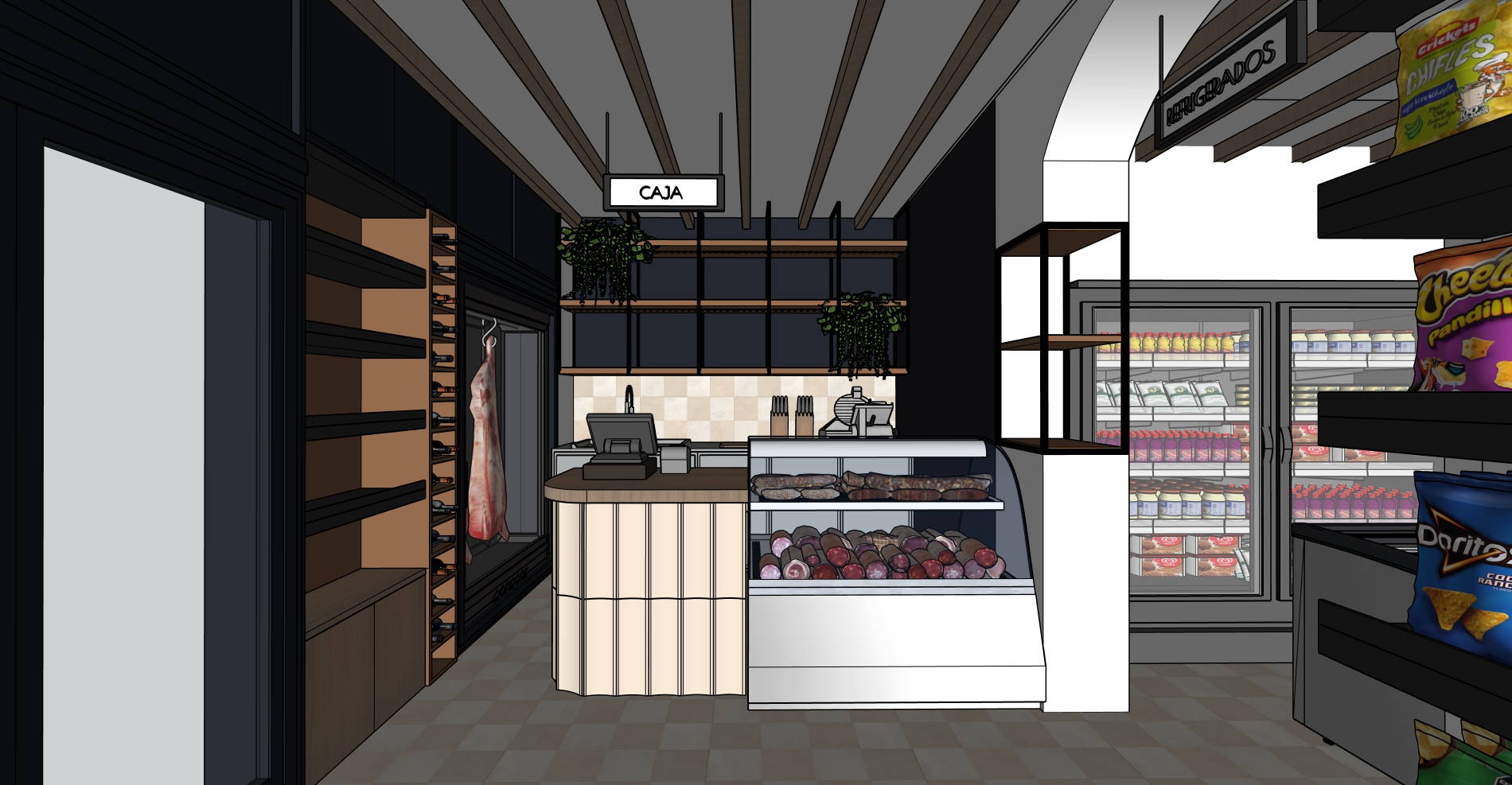 crea una imagen fotorealista a partir de este sketchup ten en cuenta que es una tienda de alimentacion los estantes y las cabinas de frigorificos deben estar iluminadas para la correcta presentacion de los productos crea la imagen de buena calidad que se vea real no modifiques texturas colores o formas quita el ruido y realza las texturas en la estanteria de la izquierda pon quesos y al lado la que es mas vertical vinos la imagen aparece un poco borrosa quiero que sea lo mas real posible donde esta la pieza de carn colgada pon quesos tambien y elimina la que has a adido