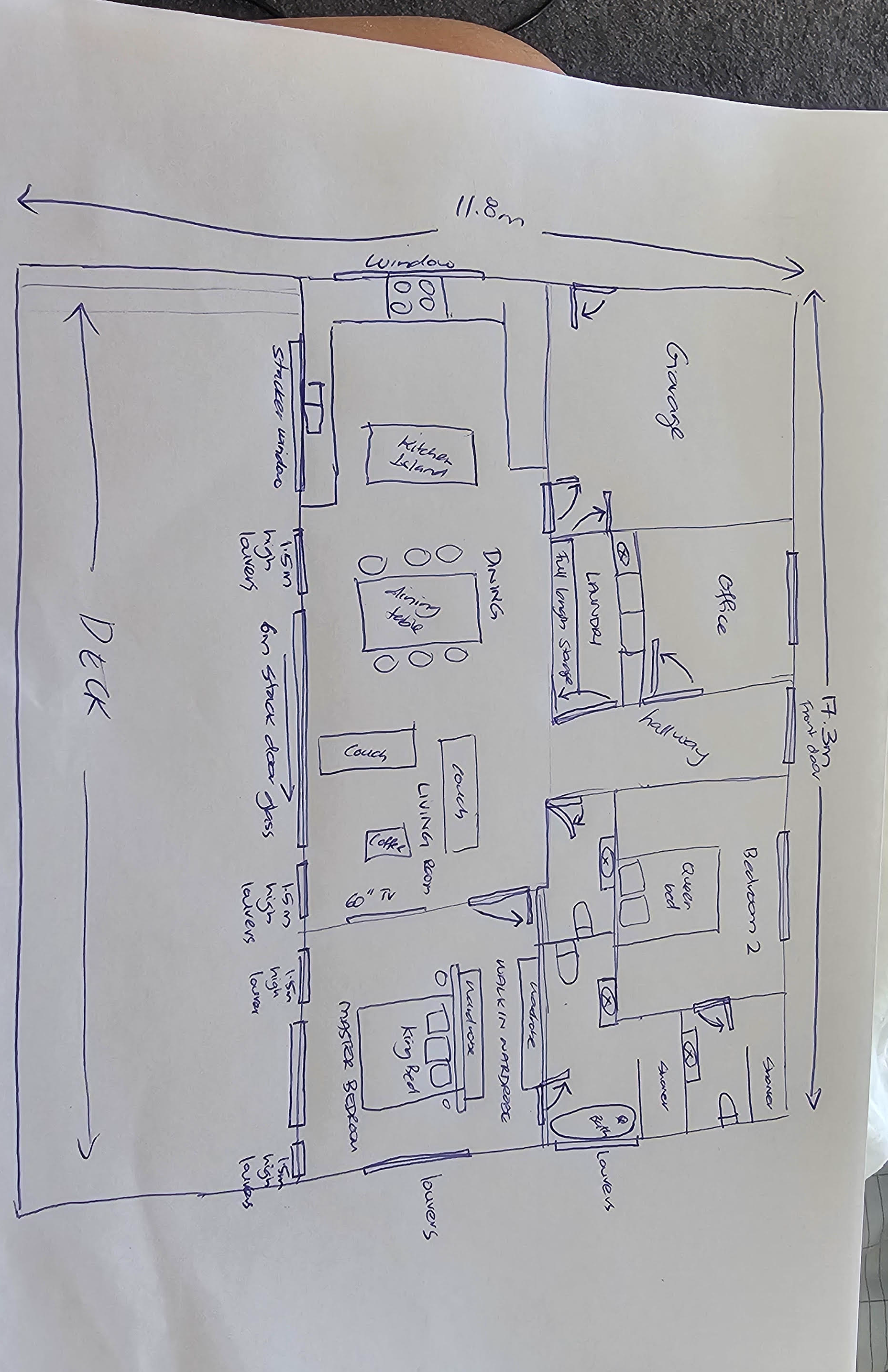 create a professional architectural floor plan drawing based on the attached hand sketch labeled updated floorplan casita 2025 use black and white linework clean drafting style and accurate proportional geometry show walls doors windows fixtures and furniture layout as indicated emphasize outer walls use thicker line weight interior partition walls thinner line weight windows and sliding glass doors show as openings with appropriate symbols kitchen counters green lines show base and upper cabinets with appliances sink stove dishwasher label major spaces kitchen dining living bedroom bath laundry linen closet etc include door swings plumbing fixtures washer dryer and furniture as sketched the goal is a clean architectural style black and white presentation drawing suitable for a schematic design sheet do not add color shadows or textures maintain straight crisp drafting lines and consistent scale output format top down 2d architectural plan centered on the page with thin black grid or reference lines removed heig from floor to ceiling is 2 7mtres use louver windows for deck side master bedroom and ensuite