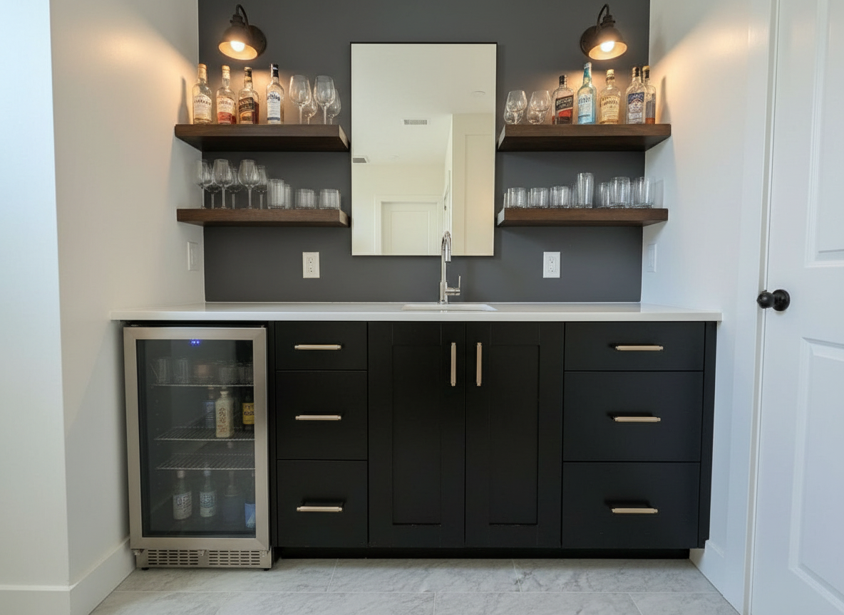 use these cabinets do not change the cabinet color in any way but make turn them into a wet bar with black floating shelves to match